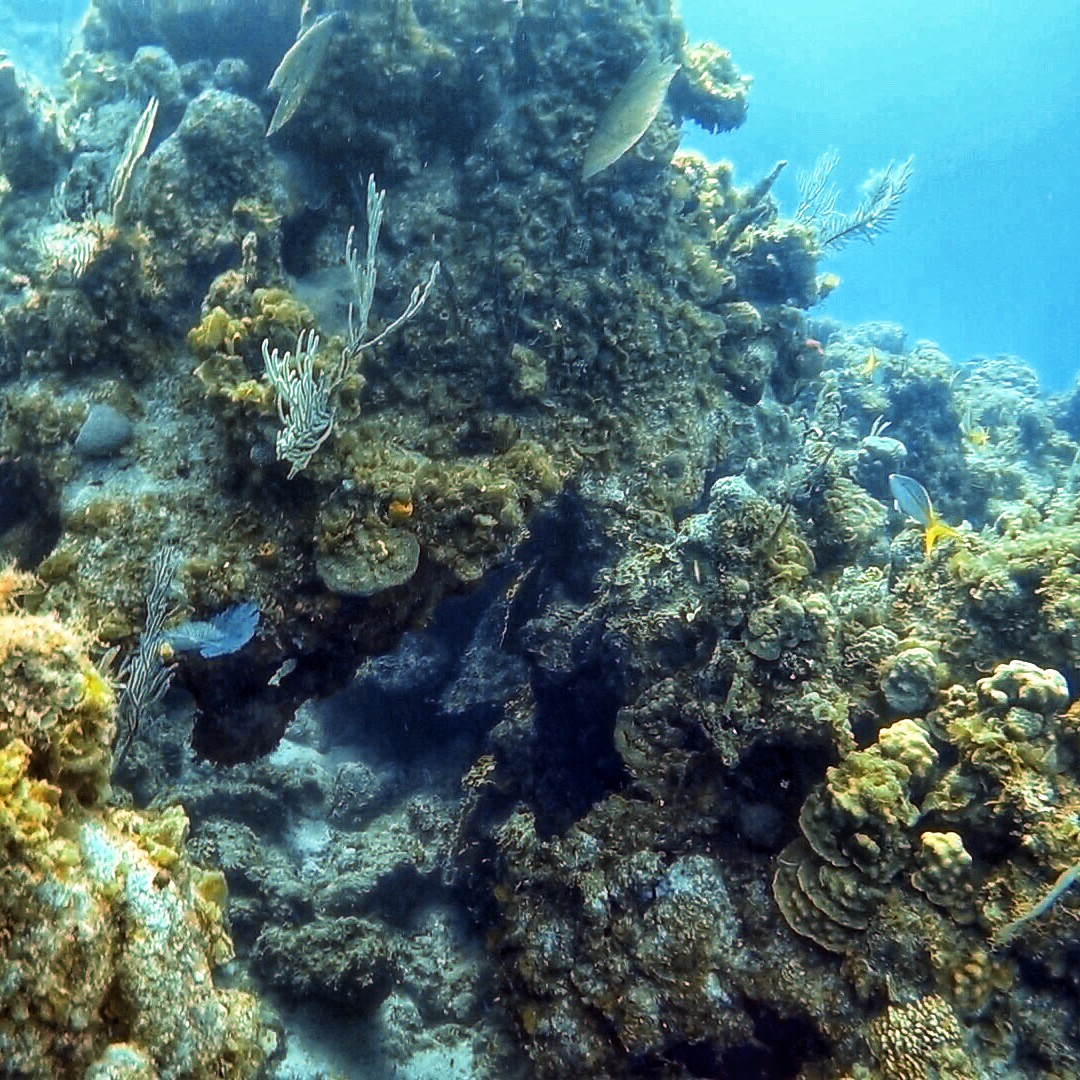 We take the dinghy further south along the coast in search of some new reef to explore. It pays off as we spot three mooring balls close together marking dive and/or snorkel spots. We tie up to one of them and jump in to check it out. The water is a bit too deep to really enjoy snorkeling though, and the reef doesn’t look as healthy here. There are large, impressive structures with lots of tunnels and swim throughs which would be fun if doing a regular dive. We check out the other two mooring balls and find that one of them has some pretty decent snorkeling, so we spend a few minutes kicking around the area.