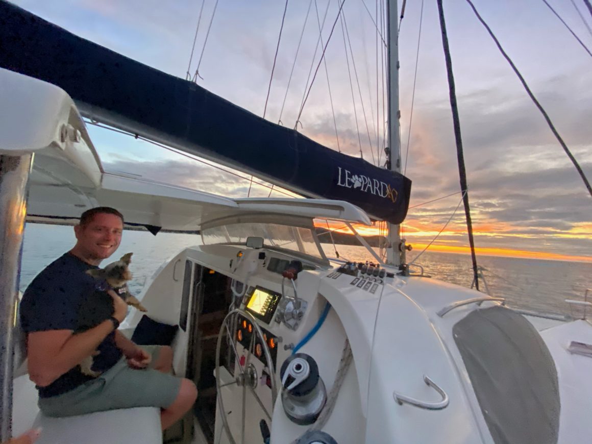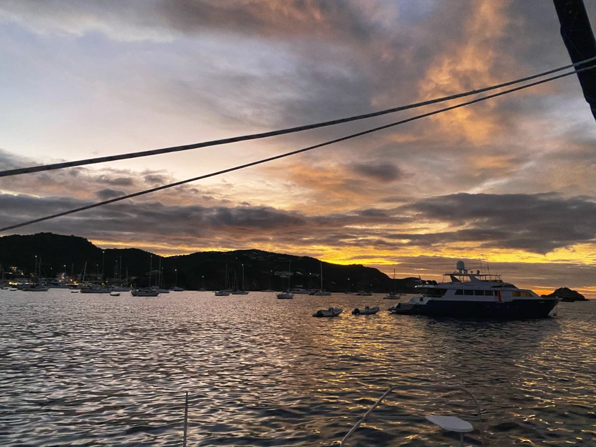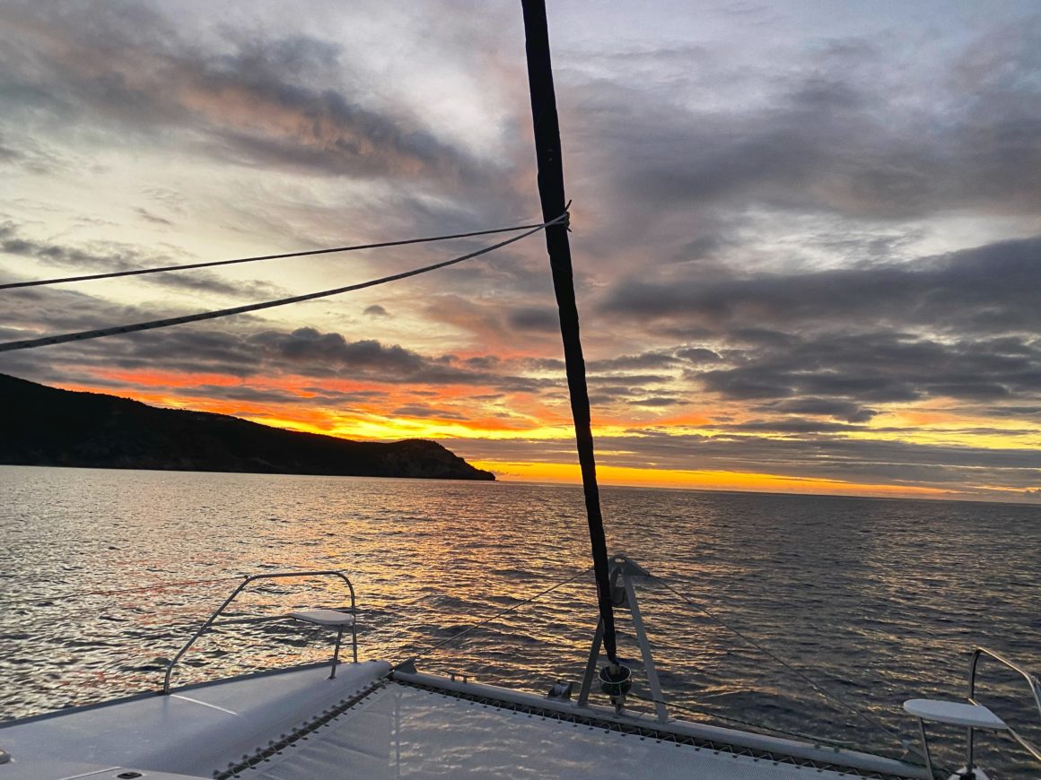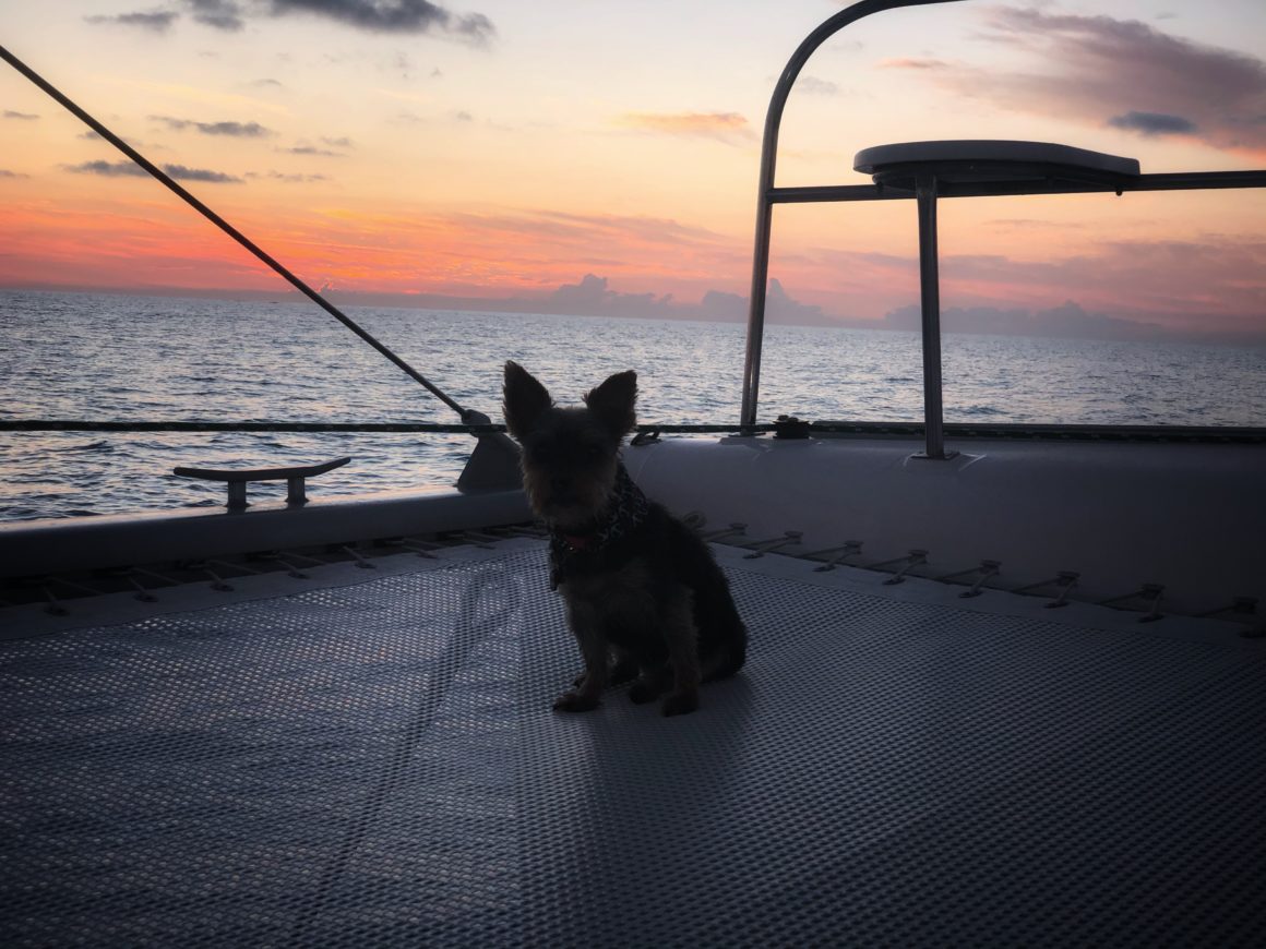 The best part about waking up before the sun is – of course – catching sunrise! It is extra vibrant today helping get our morning off to a pleasant start. Monster is less than impressed, but being the sailing dog she is, sucks it up and joins us at the helm as we wave goodbye to St. Barths.