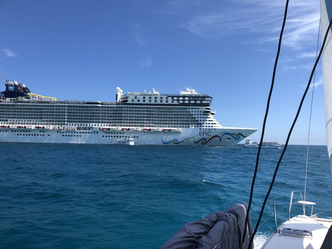 Now that we’re low on fuel and didn’t fill up when expected, we decide it’s probably time to get more serious about the whole sailing thing. I mean that is why we bought a sail boat – so we could use free wind power to move. We get both our main sail and jib up and kill the engines (first time with both sails up!). It feels great and we’re keeping a quick pace around 5-7+ knots. We sail around the north end of the island checking out the two cruise ships that have docked and anchored nearby. Apparently Norwegian and Royal Caribbean both have private islands here in the Berrys – complete with touristy beaches and a water park. We came so close to the Norwegian ship on one of our tacks, we even got a little honk from the ship!