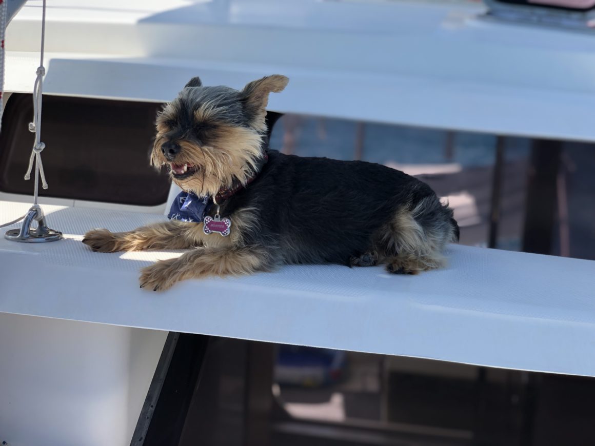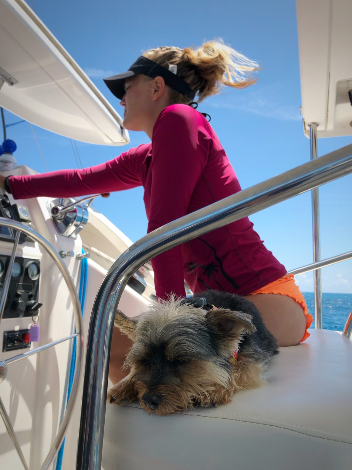 We took turns manning the helm, relaxing, and accomplishing small tasks. I got us caught up on our hand-written cruising log – which was only 6 weeks behind (oops!), planned our intended route through the Berry Islands, and managed to get some tan relaxing up on the trampoline. Monster followed me around loyally trying to find a place to nap everyone she went.