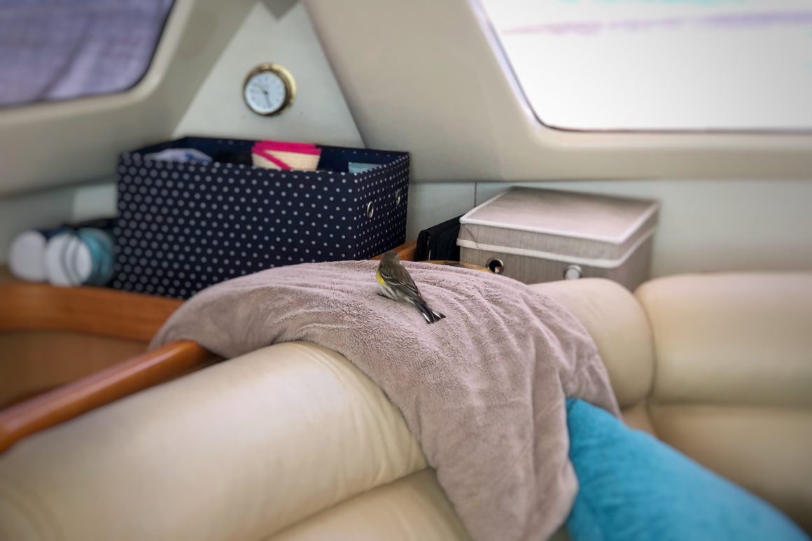 In the middle of our passage – 50 miles off Bimini and over 40 miles from the Berry Islands, a small bird that closely resembled a yellow finch lands on our dinghy davits. I don’t know how in the world he managed to make it to our boat with no land or other boats in site, but there he was. We didn’t want to scare him off, since he clearly needed some time to rest his wings so we admired from a distance. He then decided to check out our salon, flying through the open glass doors and choosing to land on our soft blanket on the couch. Ok sure, make yourself comfortable.