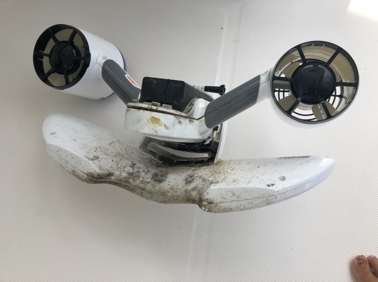 We get our underwater scooters ready to take with us on this dive since we known there can be a good little current flowing through. Matt runs downstairs to finish getting ready and I go on deck to get all our gear organized. I hear this soft beeping and immediately smell burning plastic! I run inside and see that one of the scooters is smoking, so I grab it and throw it into the ocean. Fortunately, I don’t get burned. Unfortunately, that aforementioned current is carrying the burning scooter out into open water away from the boat. I throw on my mask and fins, jump in, and swim after it. As I approach it, I feel like I’m choking on the fumes. I keep trying to grab it by one of the props (as far away from the burning battery as possible), but keep letting go in fear when bursts of smoke get worse.
