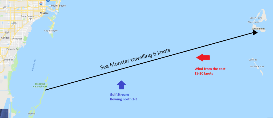 We had positioned ourselves at the northern edge of the Florida Keys in Key Biscayne area (just north of Key Largo). The idea was to give ourselves a better angle at crossing the stream so that we wouldn’t be pushing just directly east, but could use the fast current to help push us a bit north as well.