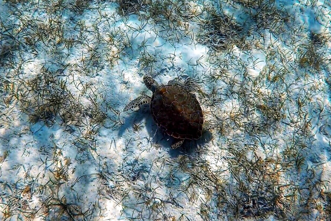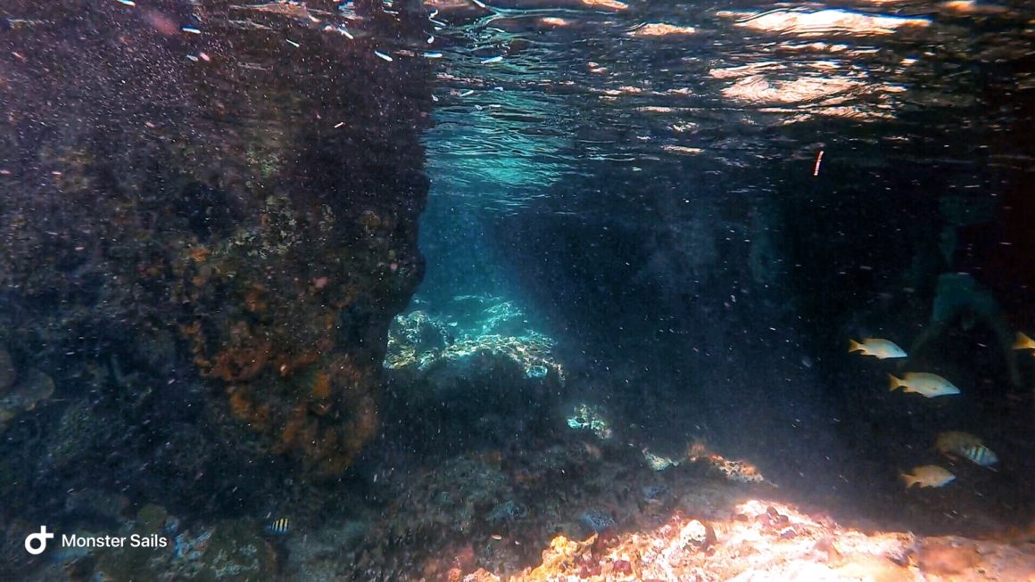 After everyone has gotten a chance to enjoy the grotto, we want to check out the reef on the back side. Since we are not at low tide, though, the back opening is no longer open (to the air). We decide the better option is to head back out the front and then just take the dinghy around. We know it will be a drift snorkel anyways, so it’ll be nice to have the dinghy dragging behind us. Starting at the far side, we all hop in the water and are rushed by pretty reef and lots of aquarium fish. We also manage to spot a small nurse shark – pretty exciting for the first snorkel! We all climb back in the dinghy so that we can drift by again. Next, we do a quick snorkel in front of the grotto – which doesn’t have much reef, but true to our expectations, we spot two sea turtles! They are quite small, but don’t seem to be afraid of us, so we can observe them pretty close-up.