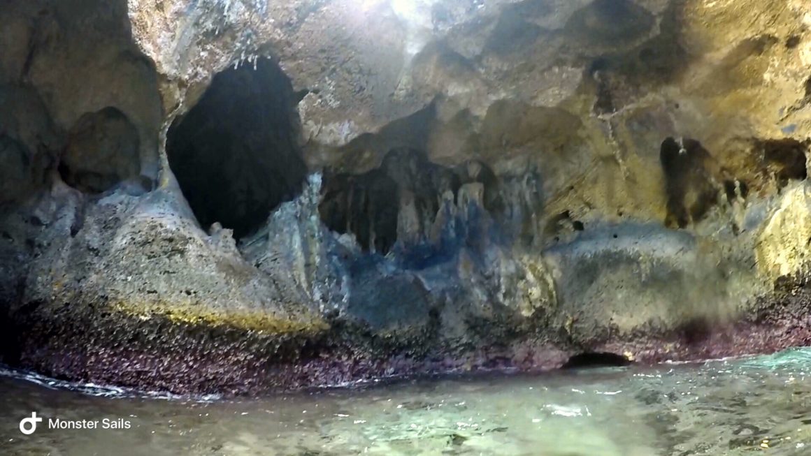 After getting our fill of the sharks, we head back to the boat and pick up anchor. We motor a very short distance over to one our favorite anchorages, Fowl Cay. We are excited to see that we have the whole place to ourselves. Given that we are close to low tide, we decide to head straight over to the Rocky Dundas caves – no time to waste. We want to have easy access to the caves and not require anyone to swim completely underwater to enter. The water is quite a bit rougher than the first time Matt and I visit, but it’s still manageable. We all enter the first cave, have a nice look around. It’s gorgeous, but really only a 5 minute activity. Then we swim to the second cave and do the same thing. There is some very nice coral between the two caves which we enjoy along the way, including endangered Elk Horn coral. After exiting the second cave, there is more current than we realized making our swim back quite difficult. I lead my parents over to a mooring ball, where we hang out while Matt puts those long free diving fins to work. He swims back to the dinghy and then drives over to pick us up! So much better than fighting the current.