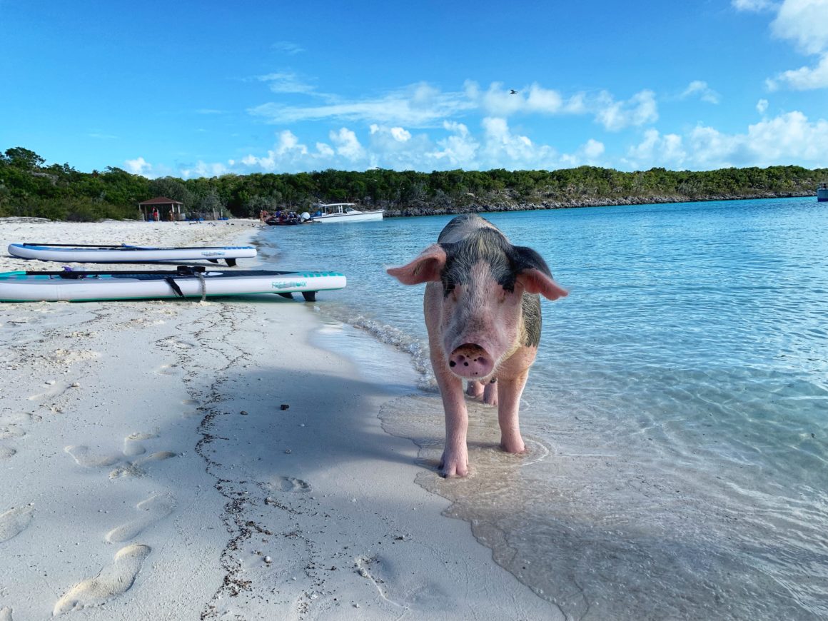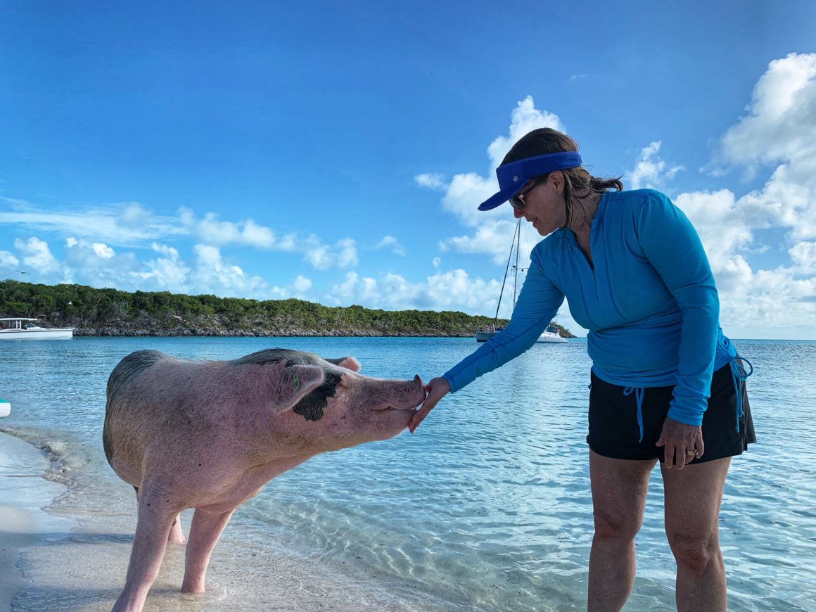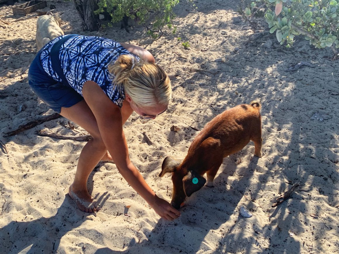 When we arrive on the beach, we notice that a couple pigs seem to be walking over to us. Yes, technically we did land on the Pig Beach, but at the far end so that Monster wouldn’t disturb them. Apparently, they plan to disturb us. I’m able to find two small carrots leftover in the water, so my Mom gives the pigs a quick treat for all the effort of their long walk. We plan to come back in the morning with the whole gang, but it’s still fun as a quick introduction to the pigs!