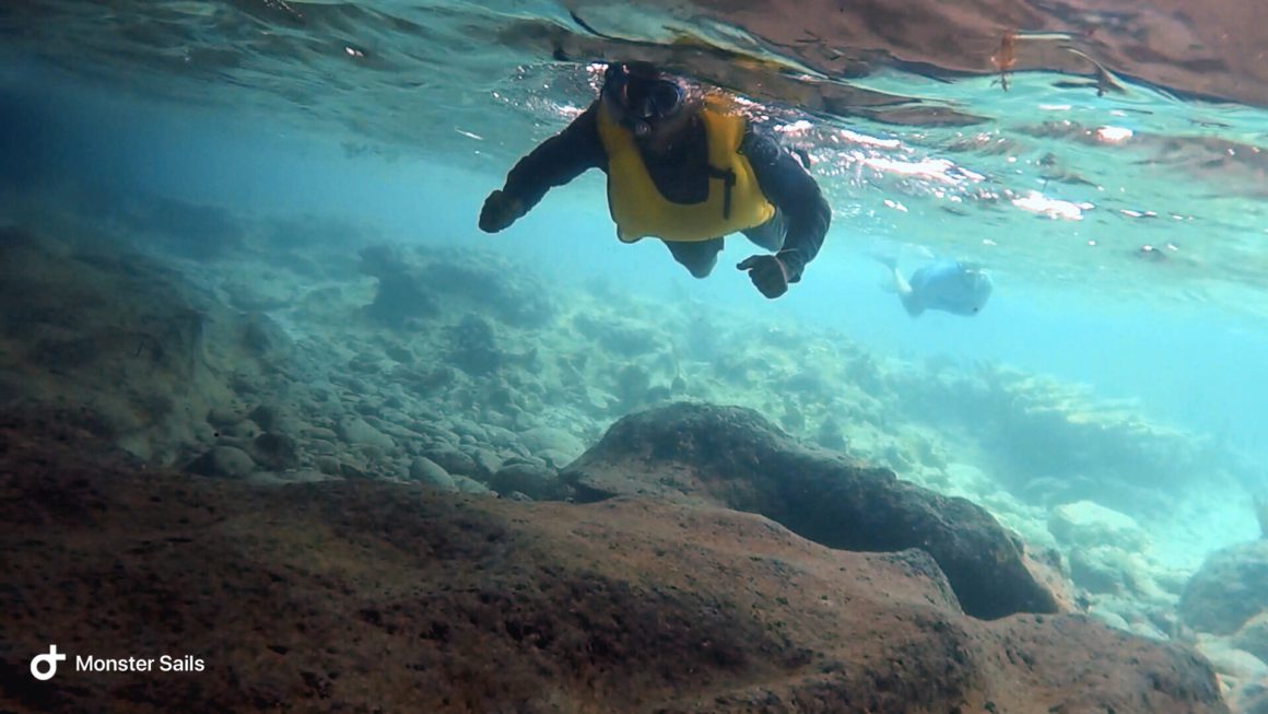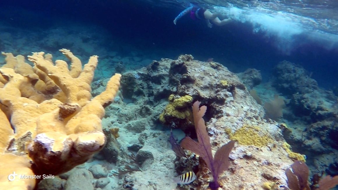 Once we get back to the boat, we decide to continue snorkeling at the coral heads in our anchorage. We grab Monster and try a new method of snorkeling with her – using a large blow up mat. She’s not very impressed, and it doesn’t work the best, but it does work. Our snorkeling turns out to be quite short, though, as there is an unexpected current coming through the area. With my parents still being so new to snorkeling, we decide to swim back to the boat and out of the current – which unfortunately also means away from the reef.