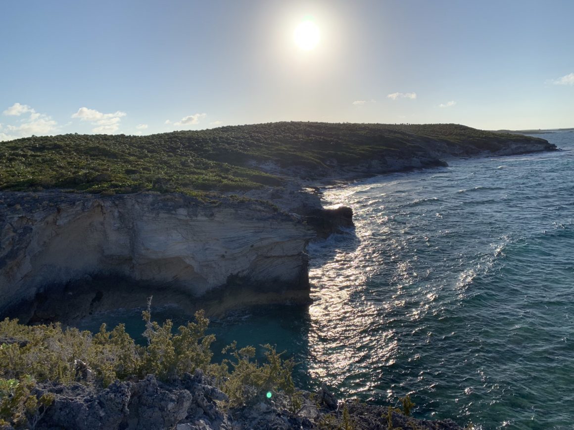 By this time, it’s getting very close to dusk so we won’t be paddle boarding after all. We do however all load into the dinghy to still head to shore. We want to show my parents the gorgeous views from on top of the hill. It’s a short hike up, with Monster leading the way. With the sun not overhead, the colors of the Exuma Sound are not quite as brilliant, but it’s still very nice. We all find a rock to add to the pile at the top – marking that we were here, before heading back down to the beach.