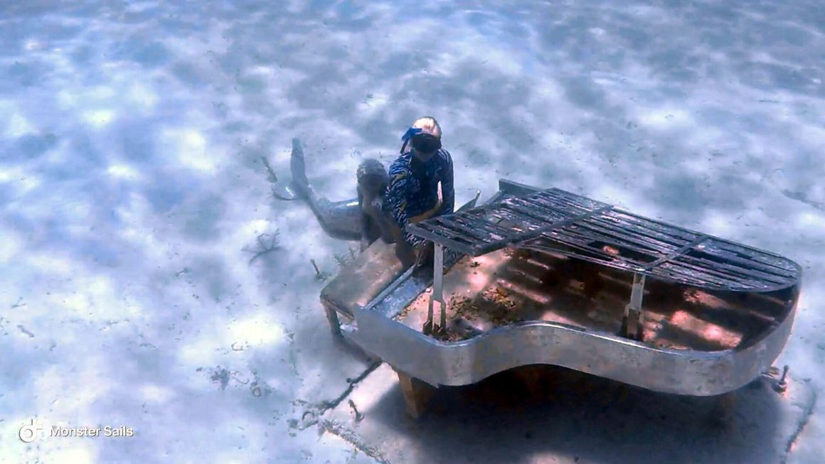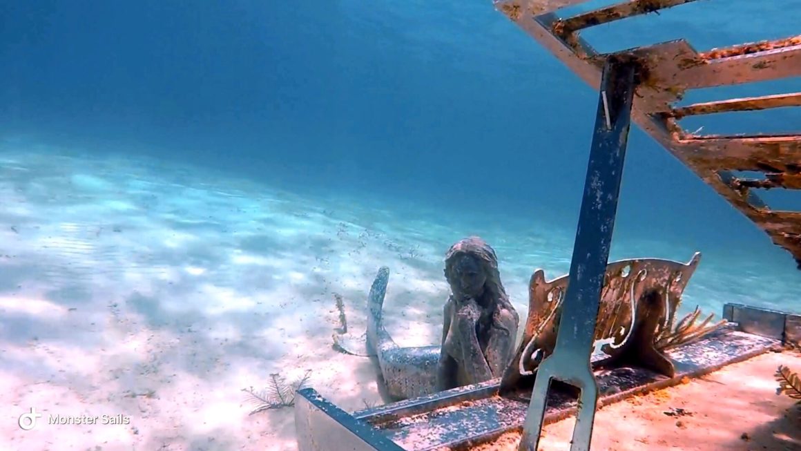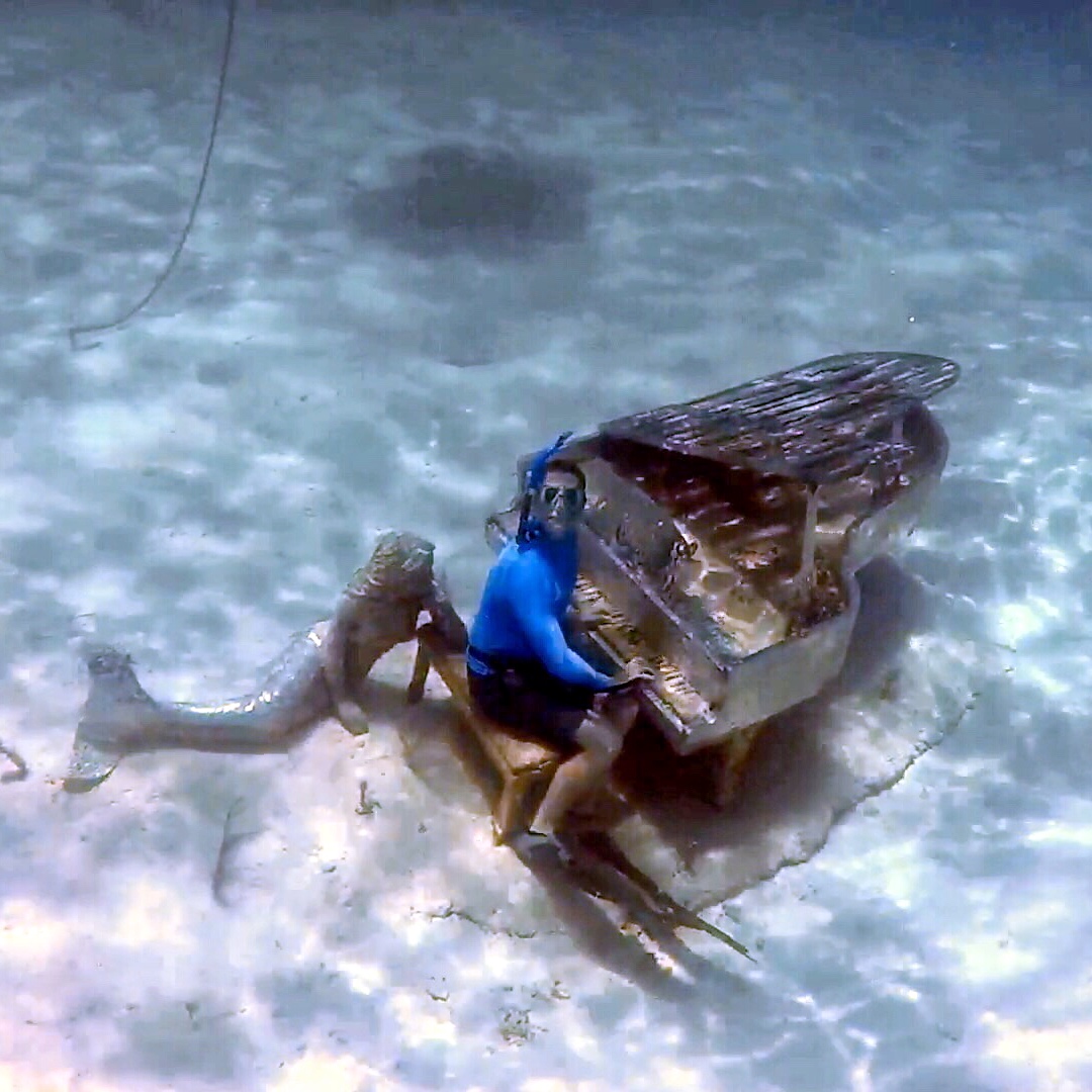Nearby is the mermaid and piano sculpture which David Copperfield had sunk several years ago. There is no real reason for it – just something fun and whimsical. We grab out snorkel gear and take the dinghy over to check it out. Per usual with almost every snorkel site in the Exumas, there is a swift current. We are trying to time it close to slack tide so that we can have an easier time actually seeing the statue and diving down. My parents decide that they are content seeing it from the surface, but Matt and I take turns diving down to get pictures with the statue. This time, my GoPro is fully charged! There is still a current, and I struggle quite a bit to have the energy to make it down, but I do make it – barely!