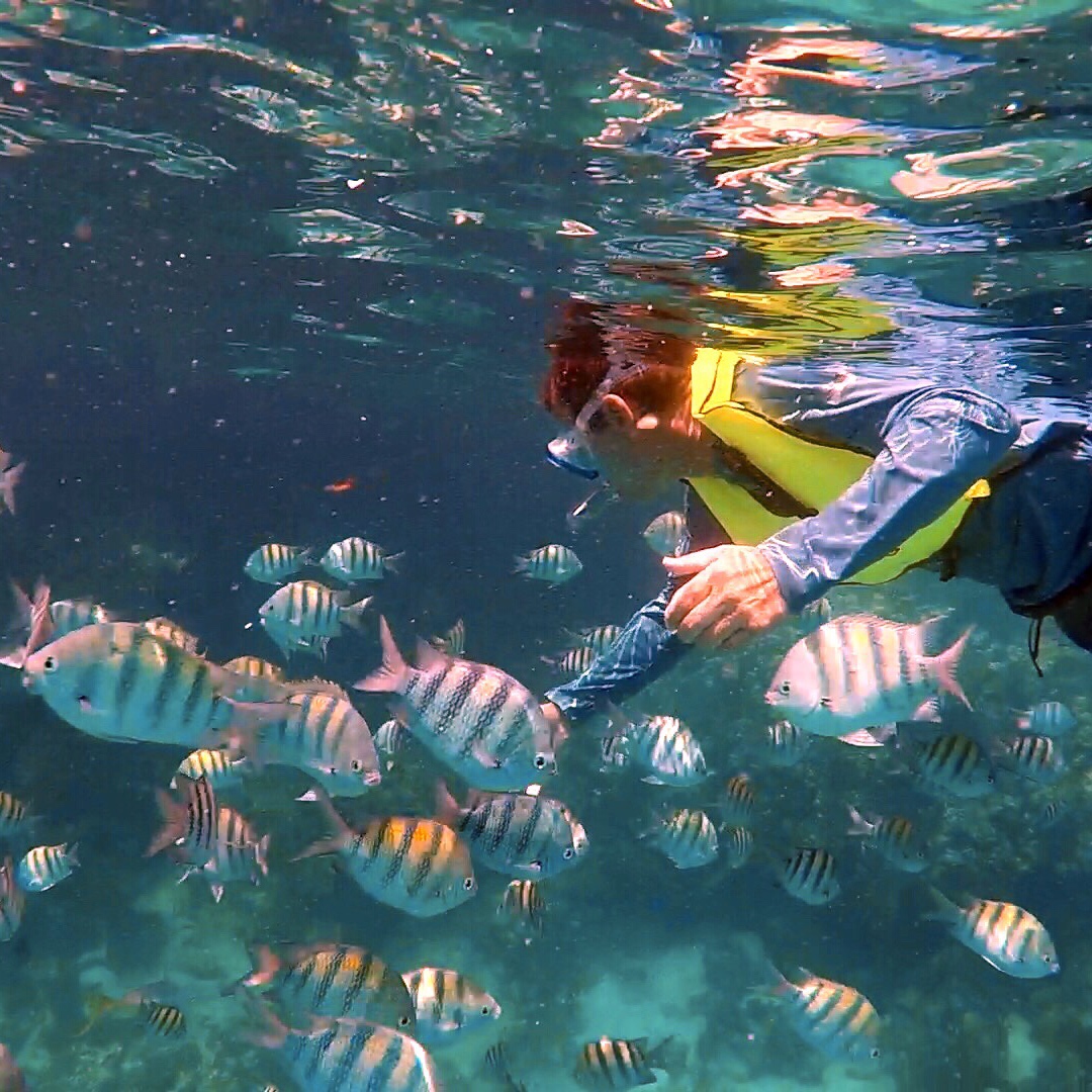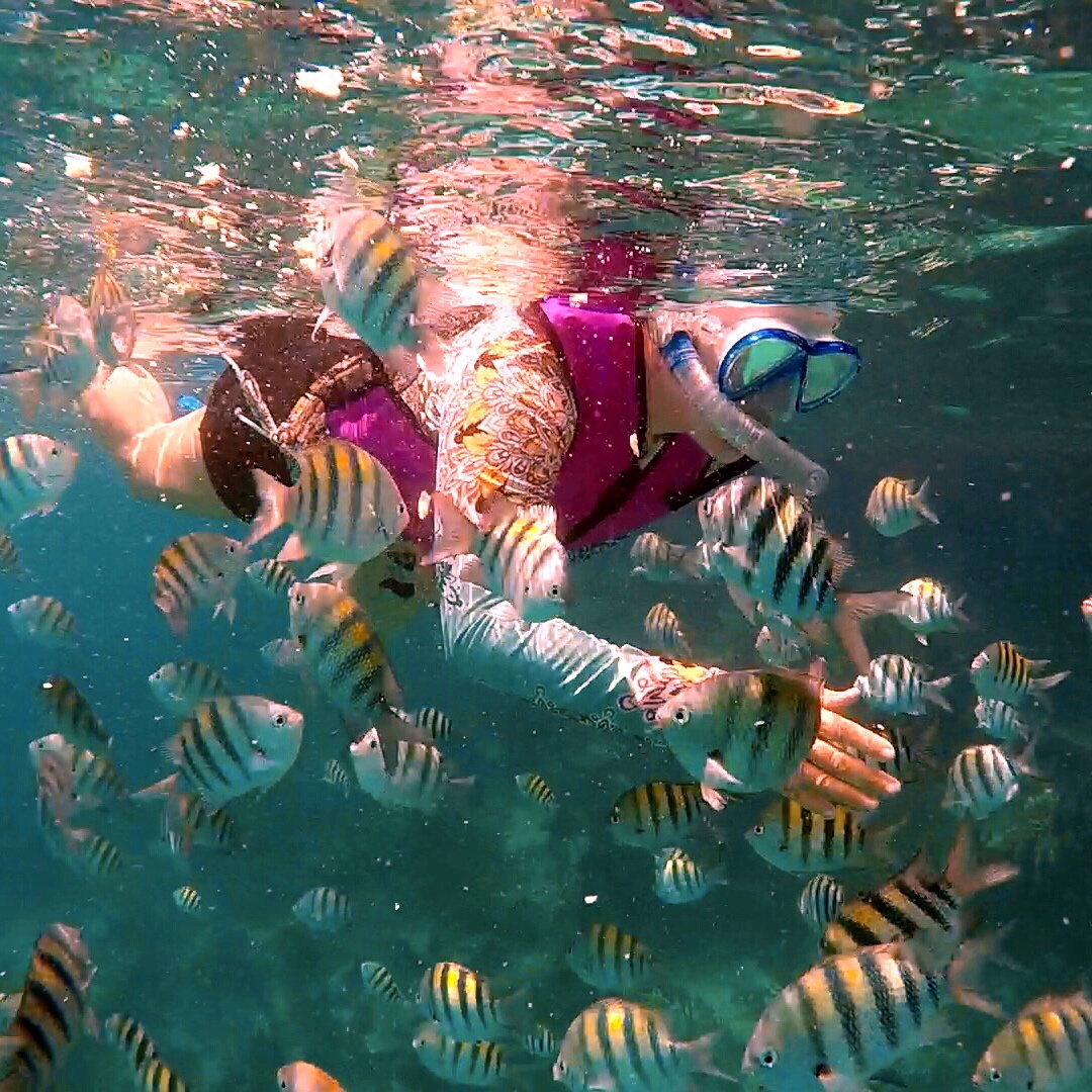 As the current starts to pick up a bit, we head over to the Aquarium – which is largely protected from the current. True to its name, you feel like you jumped into an aquarium when you enter the water. The fish here are use to being fed, so they will swarm around when a new boat pulls up. In order to give my parents the full experience, we do feed the fish just a bit at the very beginning. Matt throws the food into the water near my parents while I use the GoPro to capture some fun shots of the sergeant generals swarming around them.