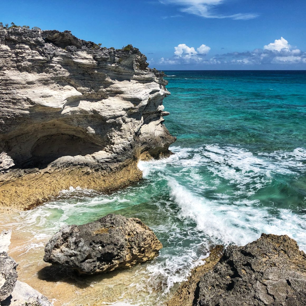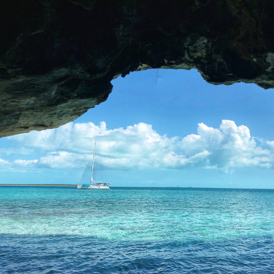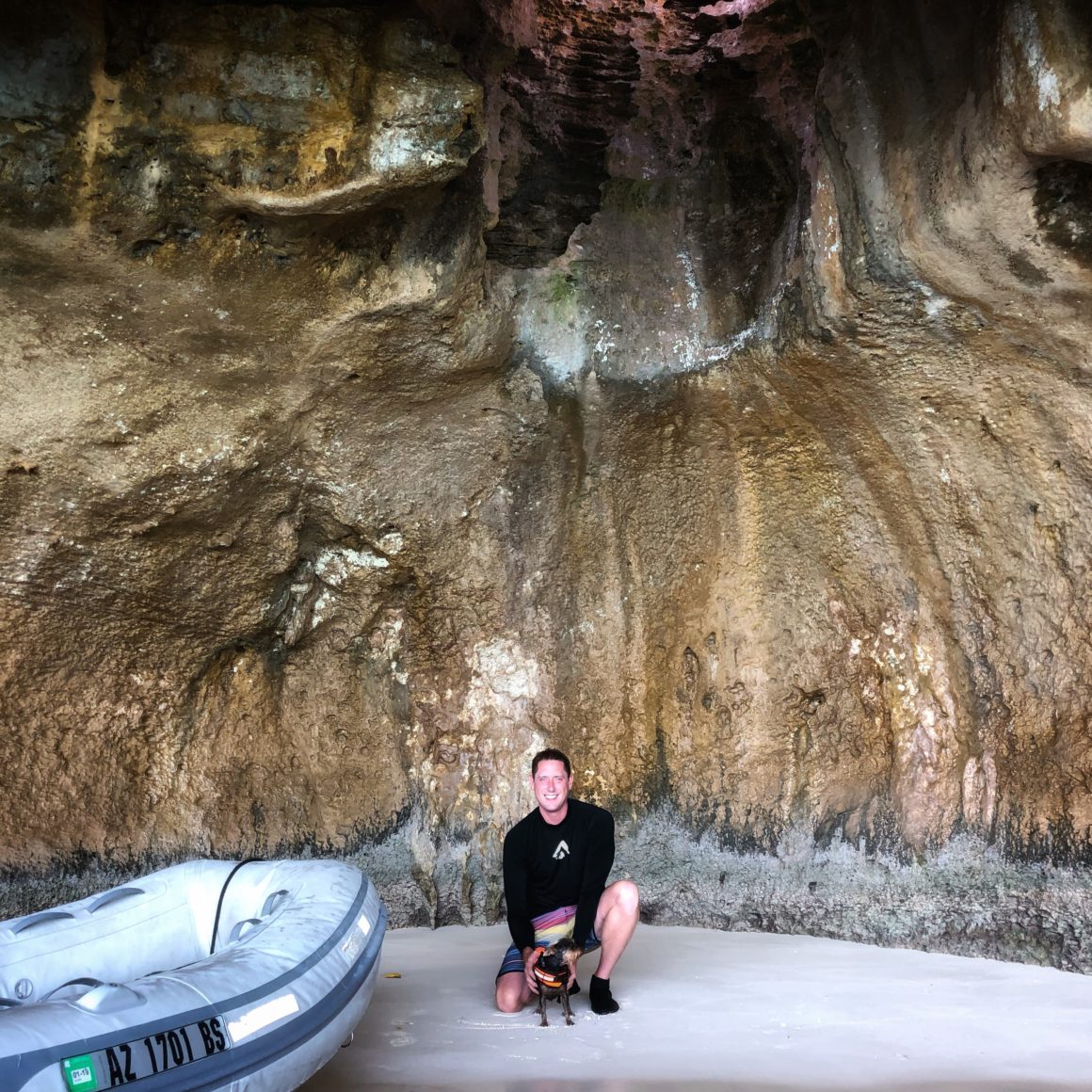 Matt had read about some nearby sand bars that become fully exposed during low tide, and are supposed to be good for finding sand dollars. Thinking that we are already at low tide, we rush in that direction hopeful to find a sand dollar to add to our shells collected from Chub Cay. On our way, we poke our heads into a small cave that we’ve heard others talk about. That took a whole 30 seconds to explore, before we decide to move on unsure what the hype is about.