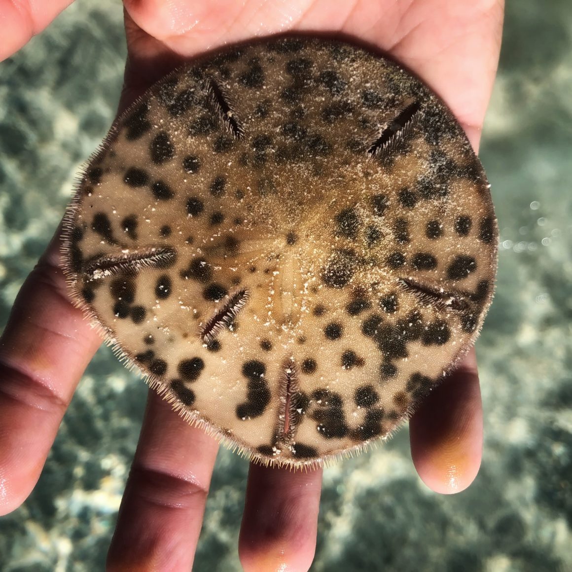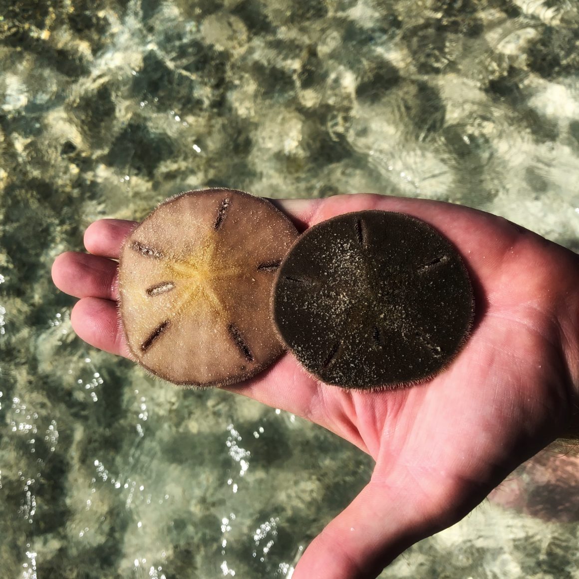 After some time walking the shallow sand bars, Matt reaches down and pulls out a dark brown sand dollar. Wow! We quickly realize that it is still alive. I think this is the first living sand dollar either of us has seen. Matt explains that he felt something with his foot, which was the sand dollar just buried under the top layer of sand. I realize I may have jumped the gun a bit getting angry about the false sand dollar review – since it isn’t false at all. We start to slowly shuffle our feet over the sand, and within a couple minutes we’re both pulling out numerous sand dollars. Most of them are a dark brown color, but some of them are a light grayish-pink. I think these may be close to dying, but I never was really able to confirm that with Google. We also found one spotted one!