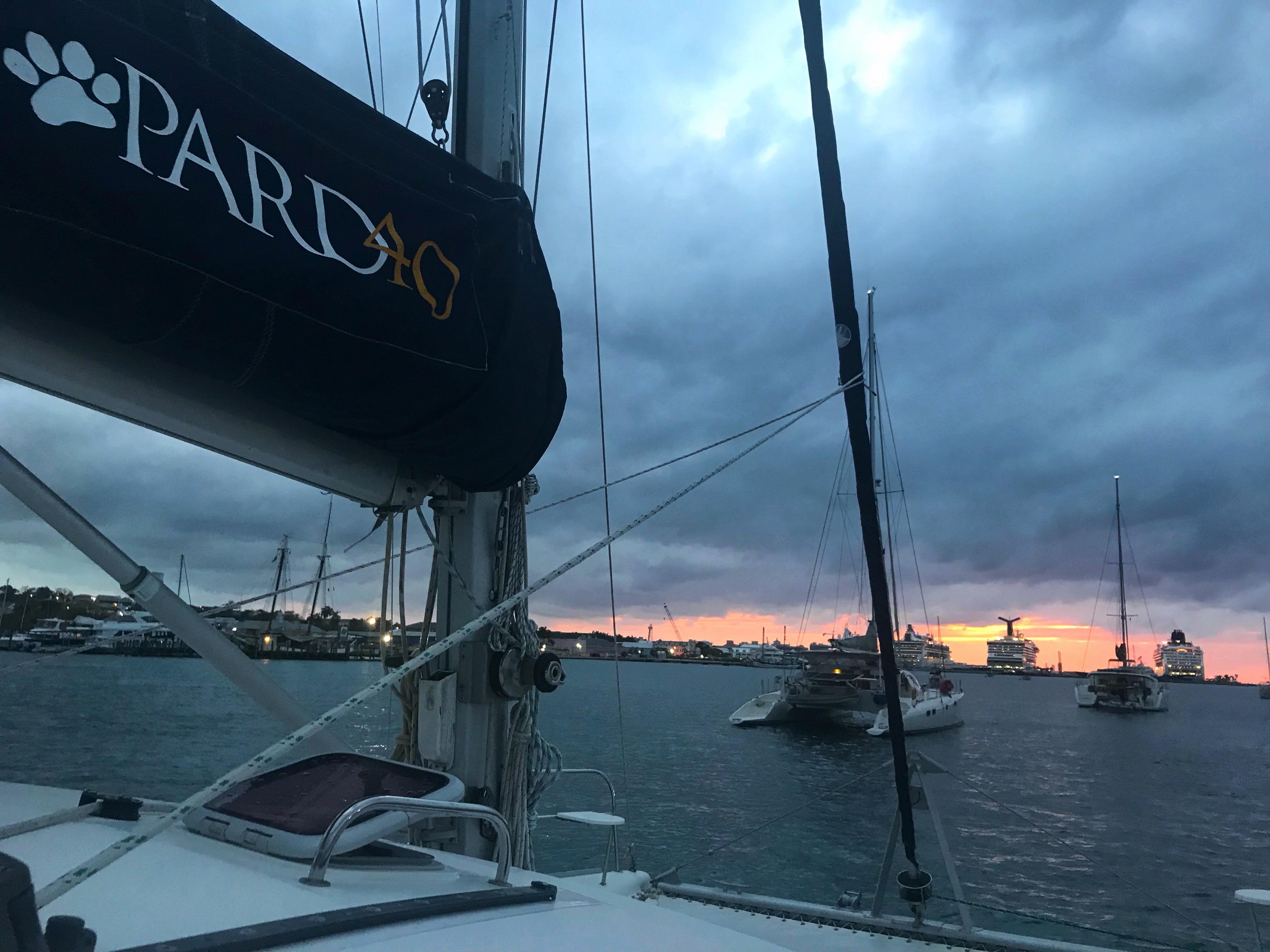 We motor our way past the cruise ship terminal which has 5 cruise ships docked at it, and make our way over to the anchorage in front of some marinas for normal (still very large) sized yachts. There are several sail boats anchored all ready, making it feel quite crowded, but we try to carve out a spot for ourselves. We then try a few more times. The depths change quickly and drastically from 6 feet to over 20 feet. There is a large difference in the amount of chain we need to have out for these different depths – and we definitely prefer the shallower depth (less chain). We also find that the bottom is a mix of mud and grass which doesn’t allow us to get a good hold on our anchor. And then, there are the sailboats which are facing in crazy directions, not into the wind as they should. We were a bit nervous to be next to one of these. After about our fifth try, we are able to drop right over a small patch of sand, get a strong set on our anchor and be just far enough away from any other boats. That’ll have to do.