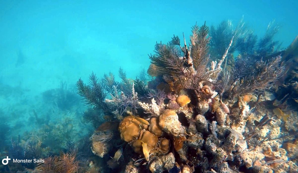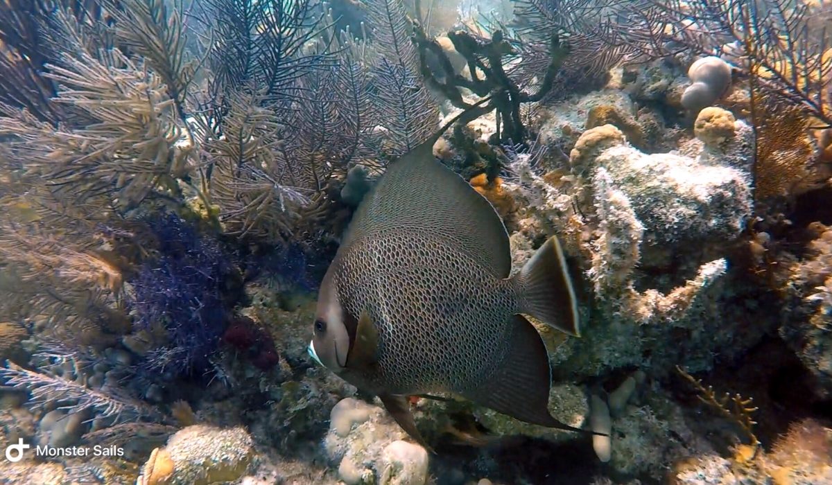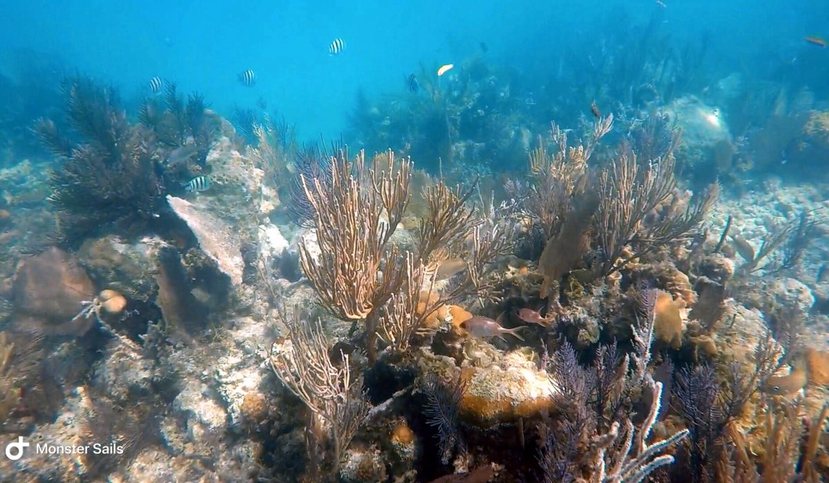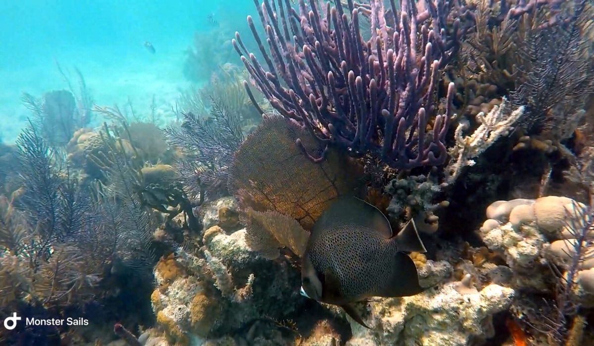 We did find a few snorkel buoys marking some decent areas to snorkel. The wind and waves are pretty rough, though, so we end up just heading towards another anchorage. On a different day, when things are more settled, we return in the dinghy to try snorkeling the Channel Marker Reef and Black Rock coral heads. The Channel Marker Reef is actually quite nice and reasonably large – siting in around 10-15 feet of water. The only bad part was even in settled weather, the visibility is still only sub-par. We swim the entire distance of the reef, passing by three snorkel buoys, with Monster and the dinghy in tow behind. The only way we can enjoy snorkeling with Monster is to drag her in the dinghy very close to us. We spot a turtle, large barracuda, and the usual fish suspects.