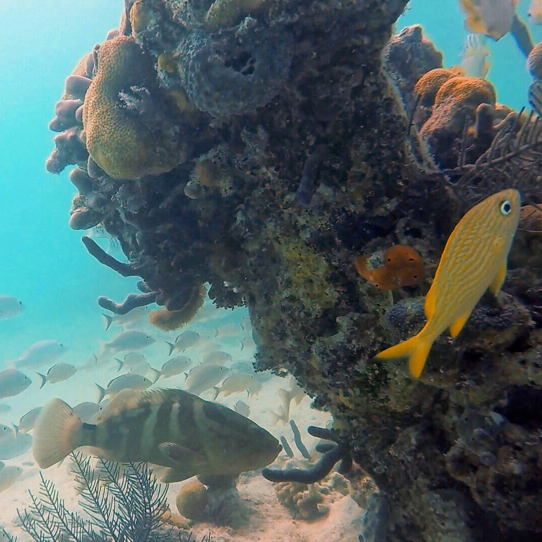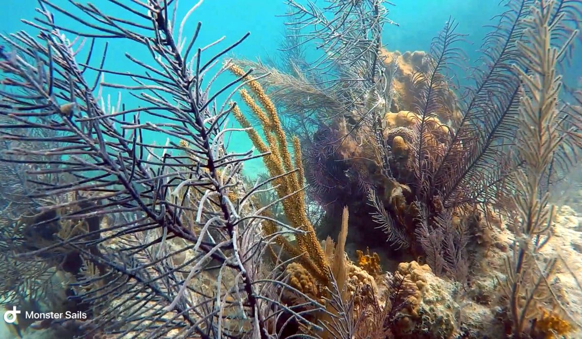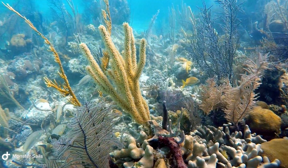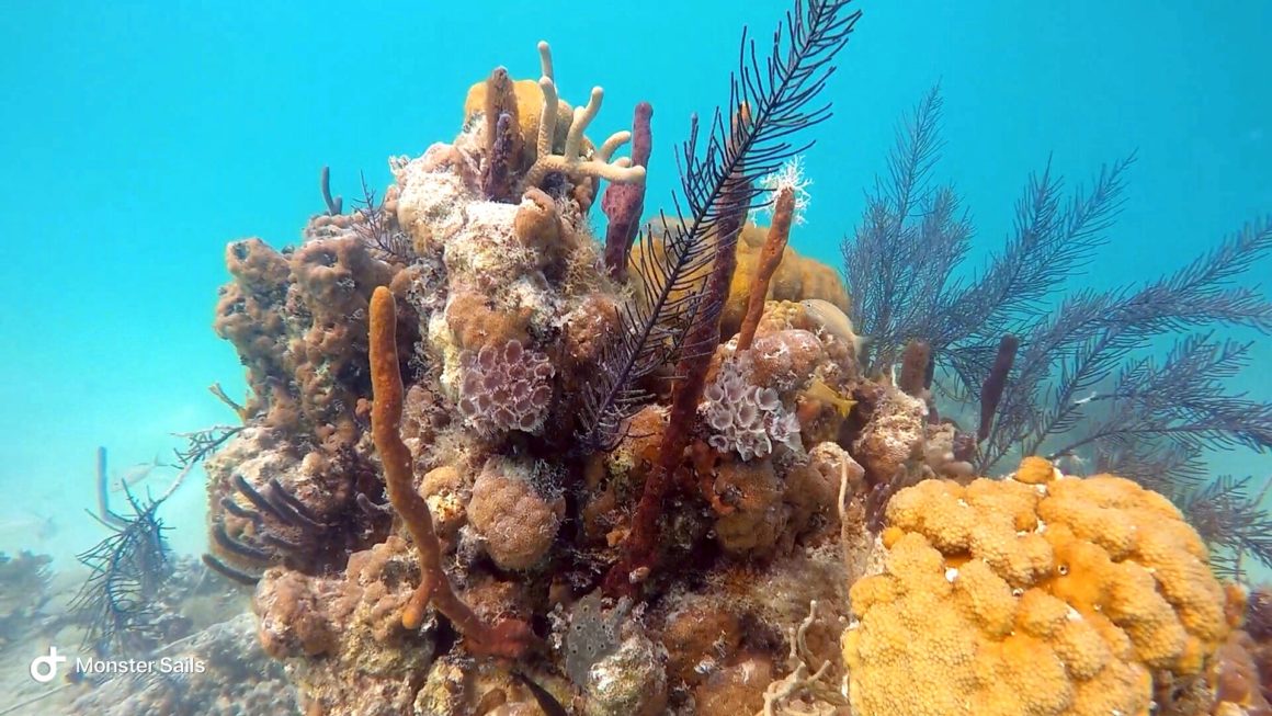 We did find a few snorkel buoys marking some decent areas to snorkel. The wind and waves are pretty rough, though, so we end up just heading towards another anchorage. On a different day, when things are more settled, we return in the dinghy to try snorkeling the Channel Marker Reef and Black Rock coral heads. The Channel Marker Reef is actually quite nice and reasonably large – siting in around 10-15 feet of water. The only bad part was even in settled weather, the visibility is still only sub-par. We swim the entire distance of the reef, passing by three snorkel buoys, with Monster and the dinghy in tow behind. The only way we can enjoy snorkeling with Monster is to drag her in the dinghy very close to us. We spot a turtle, large barracuda, and the usual fish suspects.