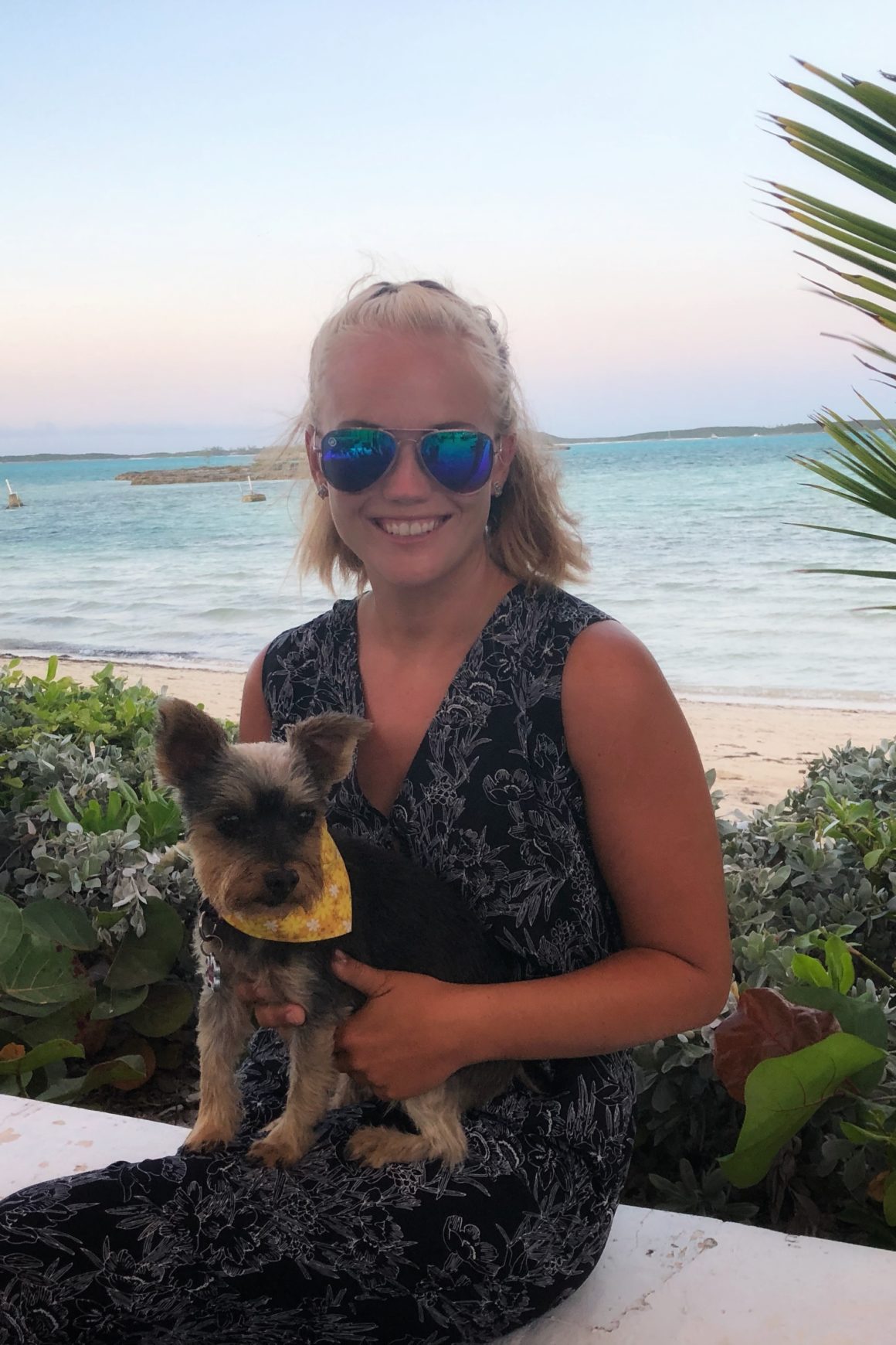 According to Google, there is a beach restaurant in the next bay over that serves pizza. So, dinner is decided. We put on some real clothes (rare!), straighten up Monster’s bandanna, and set off in the dinghy. The water in our bay may be calm, but the water just around the corner is definitely not. After making little progress, we turn around and decide that we will land at our beach and then walk down the main highway (yet another “Queen’s Highway”) to the restaurant. There is supposed to be a small trail getting from the beach to the highway. We manage to miss it and instead exit out someone’s backyard (oops). It’s a short walk to the restaurant, and we arrive to find it empty – like most restaurants we’ve visited in the Bahamas. Since Monster is with us, we have to sit outside – which is completely fine, except for some reason they don’t provide service outside. Matt goes in and orders us a pizza and two Kalik “to-go.”