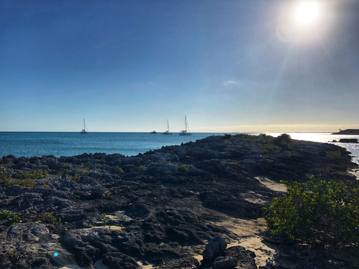 Just around the island a bit, is another beach where a local group has copied the infamous pigs of the Bahamas (originally located on Staniel Cay, Exumas). You can now swim (or rather just feed and pet) pigs of the Bahamas on Meek’s Island as well. A bit annoying and probably bad for the pigs in my opinion, so we don’t support it or stop by. We do motor by slowly in our dinghy, though, and it appears the pigs may be kept in a fenced in area until a tour boat shows up at which point they are let out and all run over to a table on the beach where there is clearly food. We’ve heard that these pigs have not yet learned to swim out to the boats as have the ones at Staniel Cay.