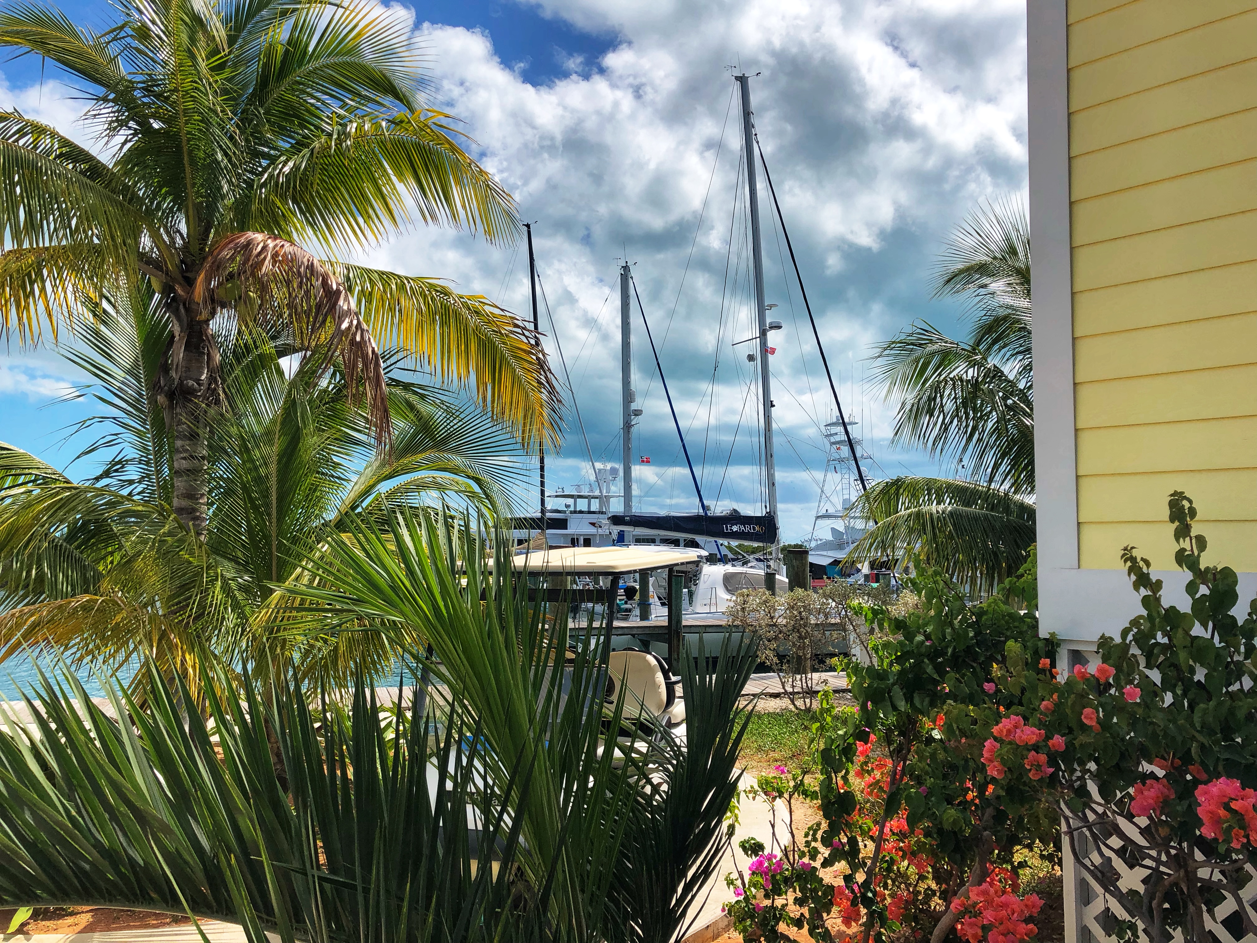 The marina is quite cute with lots of colorful, tropical flowers and a swimming pool. It’s pretty small, though, without much area for Monster to explore. We decide to take a walk through town to stretch our legs and see what all the fuss is about (Spanish Wells is talked about quite highly). It is very “Caribbean” with colorful purple, pink, and turquoise hoses lining the streets and tropical plants overflowing into the small paved roads. Just a short ways in, and we can already see the ocean again on the other side.
