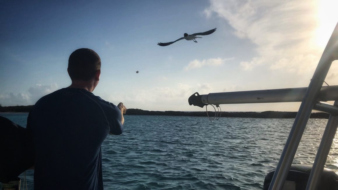 As it approaches dinner time, he’s hinting that he’d like some fish thrown his way. We don’t have any fish of course (haven’t even attempted fishing yet – oops!), so we tell him he’ll have to settle for some bread. As any polite dinner guest, he happily accepts the bread with no complaints. Initially, Matt is setting the bread out for him on top of the dinghy, but that doesn’t seem like much fun for any of us. The seagull hovers just behind the boat at arm’s length so that Matt can toss pieces of bread into the air and he can swoop in to catch them. Now we’ve got dinner and a show!