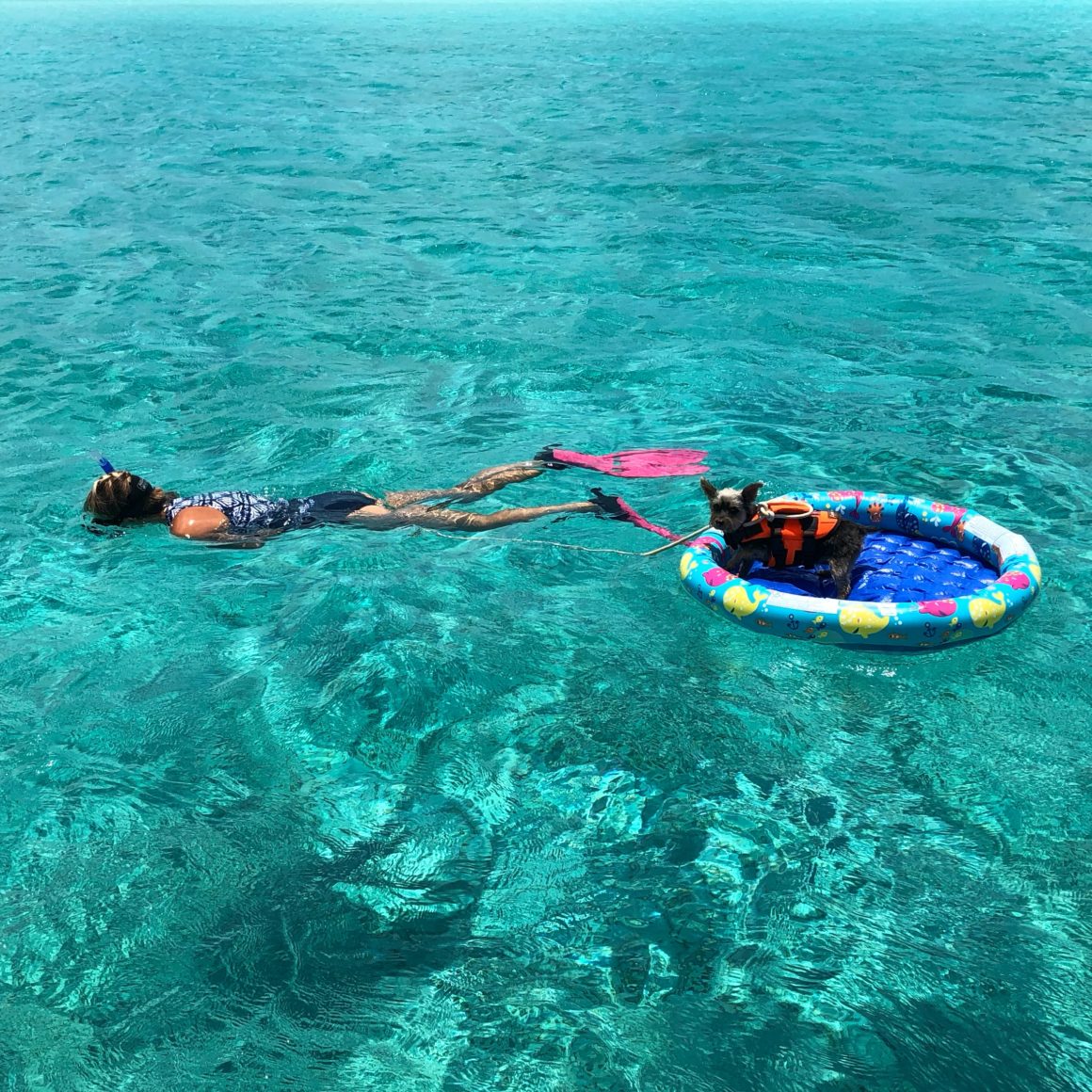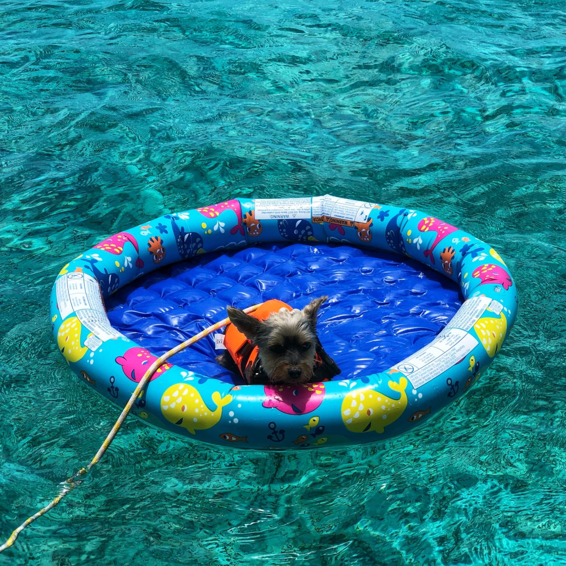 When Matt has a break from work, he joins me in the water and we decide to try taking Monster with us. Now she’s already tried snorkeling once and decided she preferred to keep watch from the dinghy. This time, we aren’t taking the dinghy, so we decide to try using her inflatable pool – yes, she has a splash pool on board. I place her (still wearing a life jacket) into the floating pool and tie a rope so she can’t float away. At first, it seems genius and appears to be working well. Then she realizes that she’s still on the water and not solid ground. It goes downhill from there. We struggle through a 10 minute snorkel before Monster goes back to barking at us from the boat. We’ll have to keep working on this.