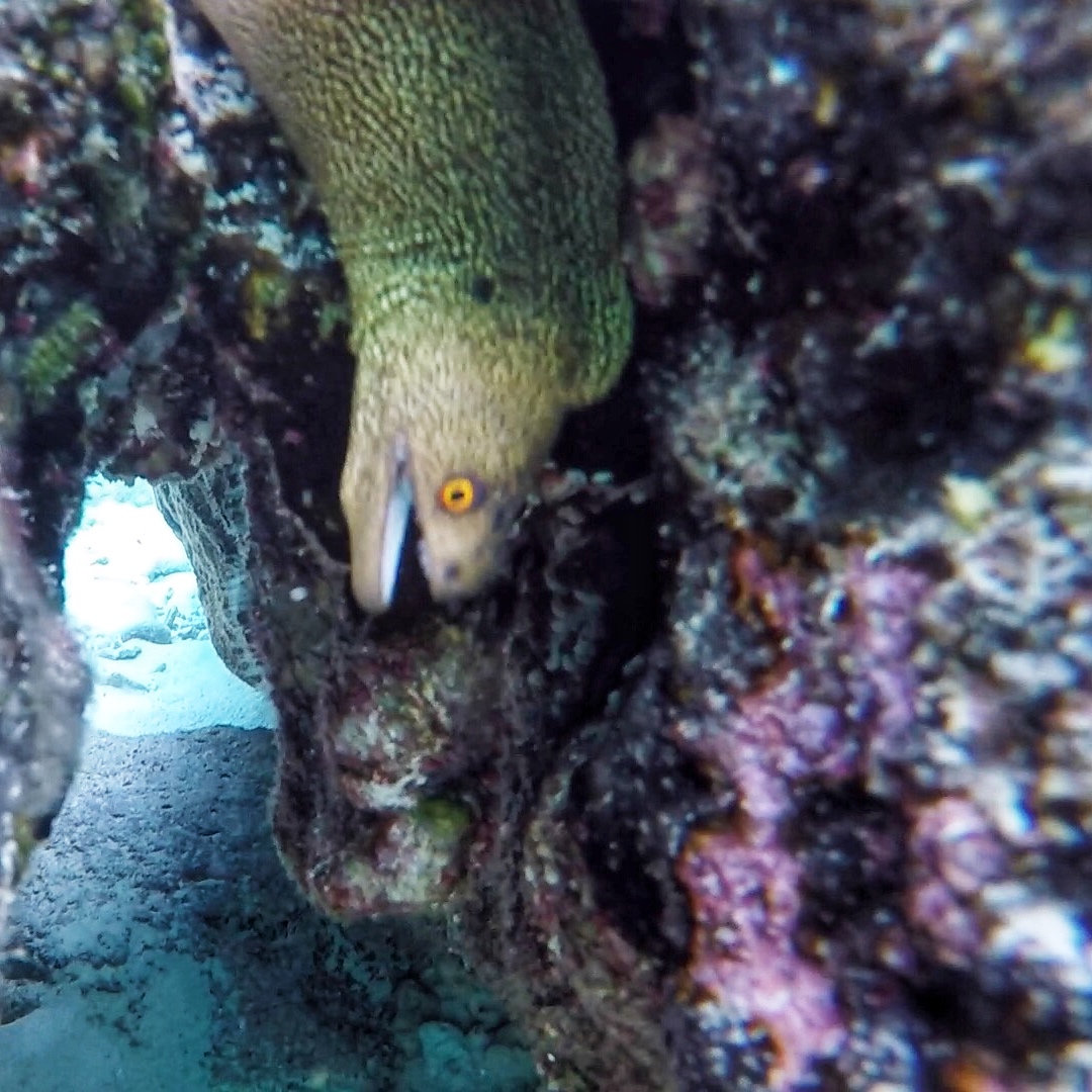 First, we are impressed by how nice the coral and snorkeling is around the cave area – very pretty. We even spot a free swimming spotted eel – first eel of the Bahamas for us! We don’t get a video of it actually swimming, but we did get a photo of its smiling face (we prefer to think of this as a smile). We head into the first cave and are even more impressed. It’s small, but much larger than we expected and you can fully enter and be almost “enclosed” within the cave. The walls are gorgeous colors and large stalactites hang from the ceiling.