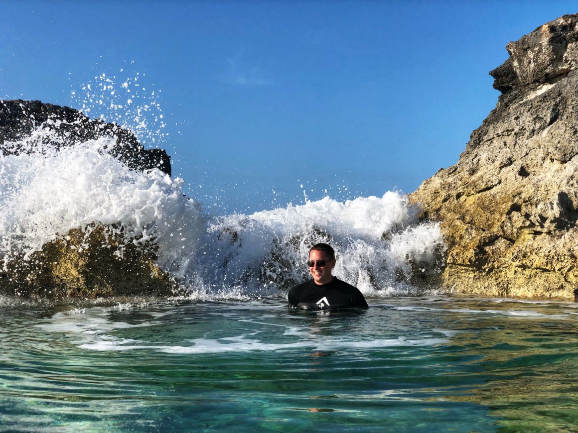 We wonder around a bit and build our own rock sculpture – why not? After a few more minutes, we begin to see some waves crashing in over the rock formation into a small pool of water. You know what – that does look a bit like a bubble bath. A sad bubble bath that needs more bubbles, but a bubble bath all the same. We’re at a rising tide so as the tide level continues to rise, the waves and bubbles continue to grow. We’re the only ones here so we decide to wade out into the “bubble bath” to get the full experience and snap a few photos!