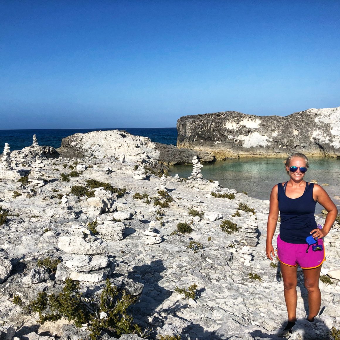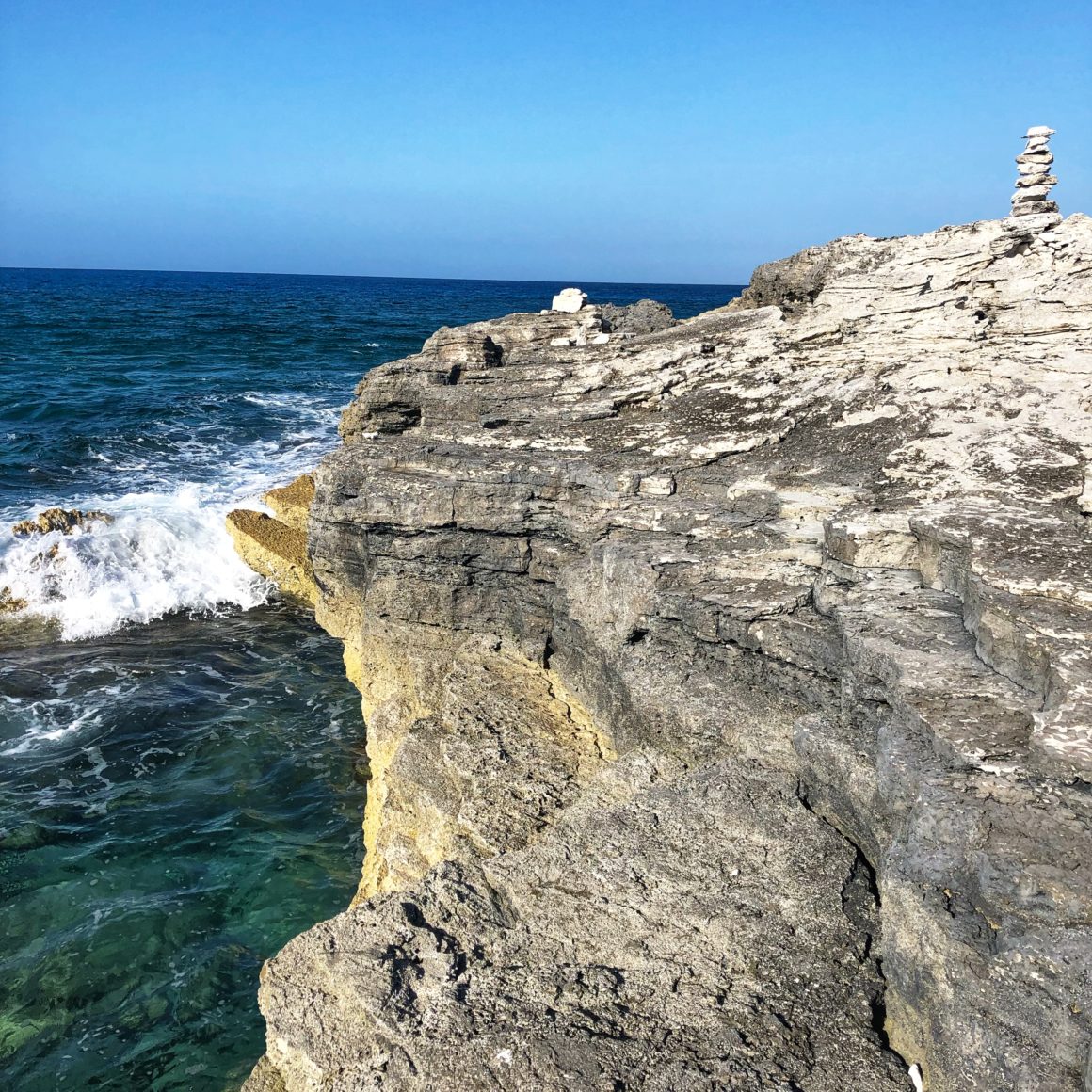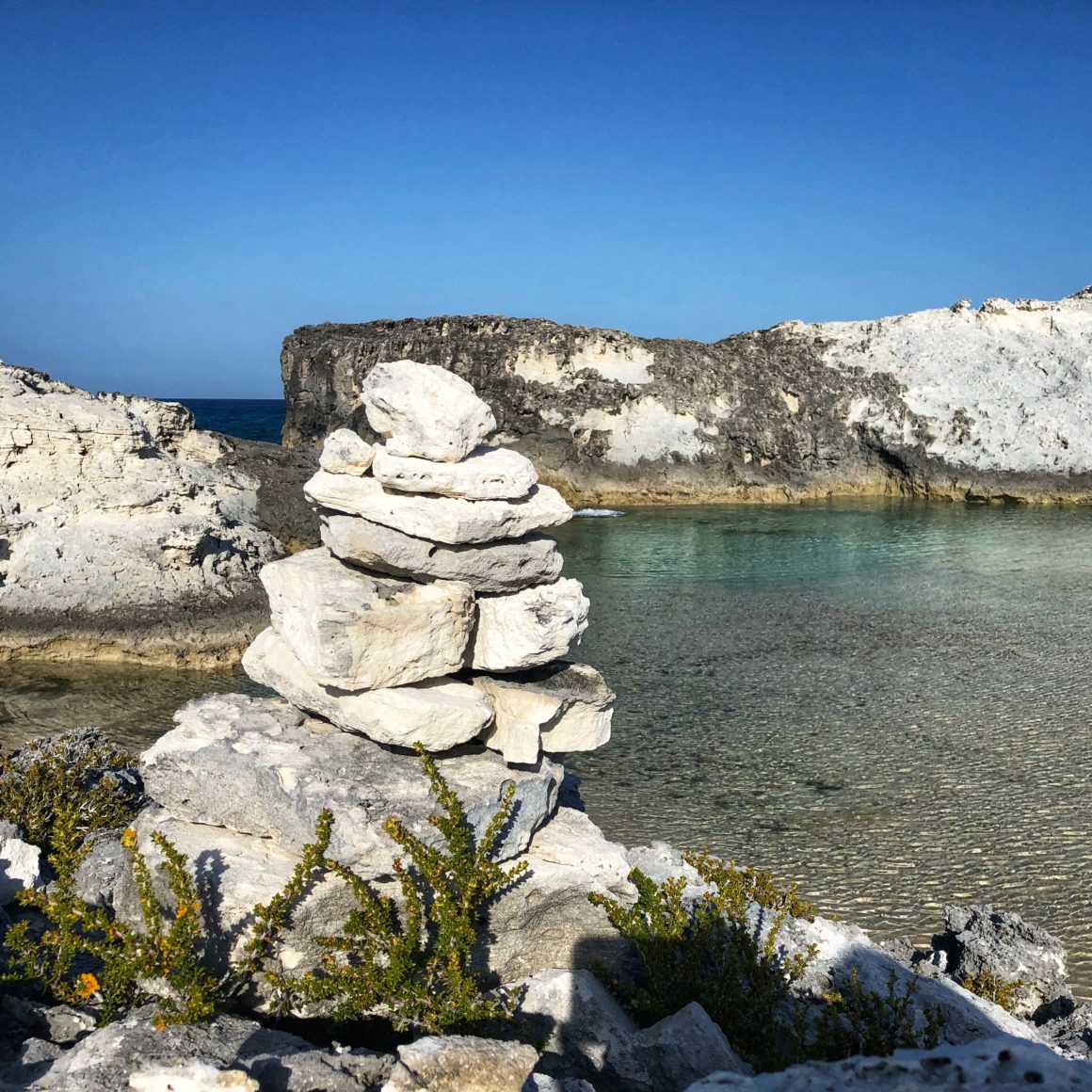 Given that there’s still some day light left and we need to get Monster to some sort of land, we decide to head on over to Rachel’s Bubble Bath. We land our dinghy on the beach and follow what looks like old footprints in the sand towards the Atlantic side. As we near the area, we begin to hear waves crashing and see those little artist rock piles that everyone builds nowadays. Seems like we’re in the right place, but we aren’t really seeing anything that resembles a bubble bath.