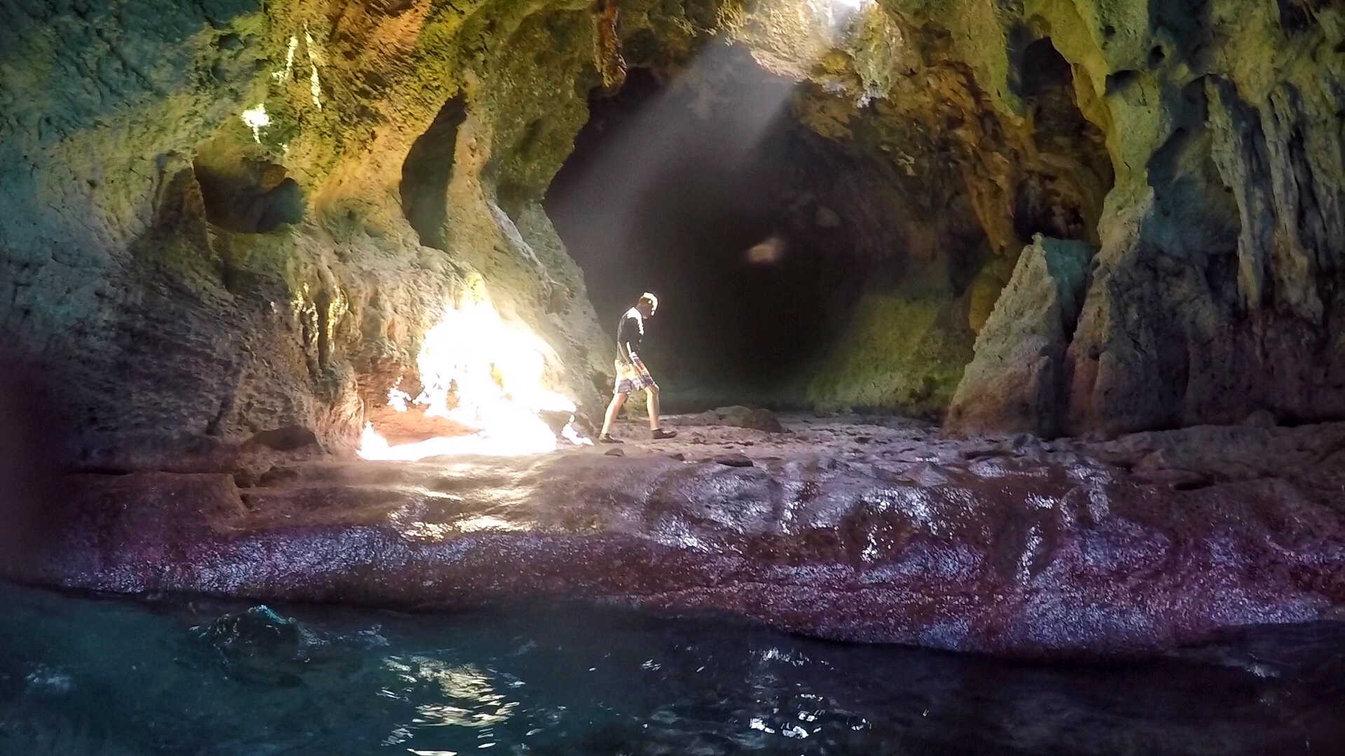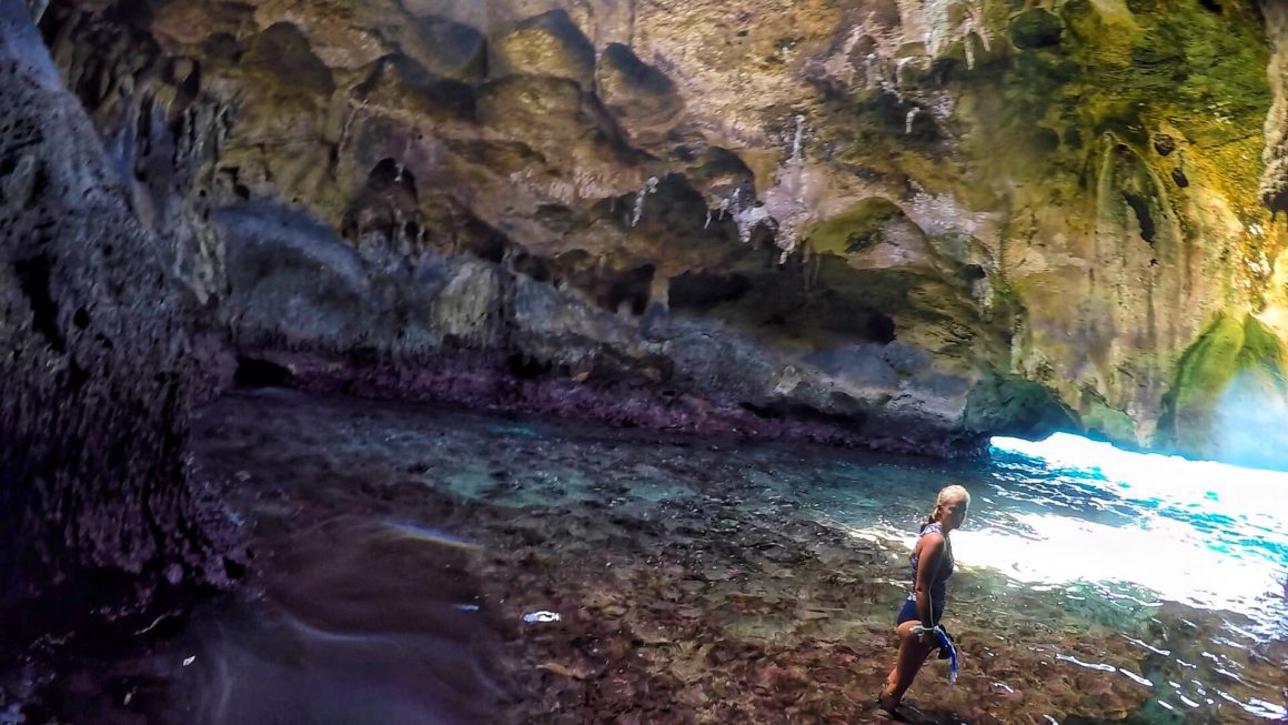 After enjoying the view and capturing a few photos, we snorkel our way over to the second cave. It looks very much the same and is just as pretty, but this one has more space to move and a small area to get out of the water to poke around. Sunlight pours in from above where a few holes are present in the cave’s ceiling. Below is a short video showing the inside of the caves – check out all the colors!