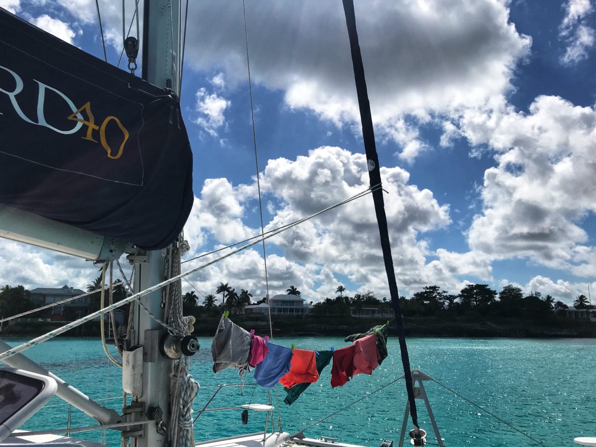 Living on a boat, you learn to wear clothes for a longer period of time than you do on land. Washing a pair of shorts after wearing them for only one day – absolutely not! Your clothes still get sweaty and salty, though, so eventually you do need to wash them. We are fortunate to be a vessel that has a washing machine on board – quite a luxury really! Here’s what doing a load of laundry entails for us.