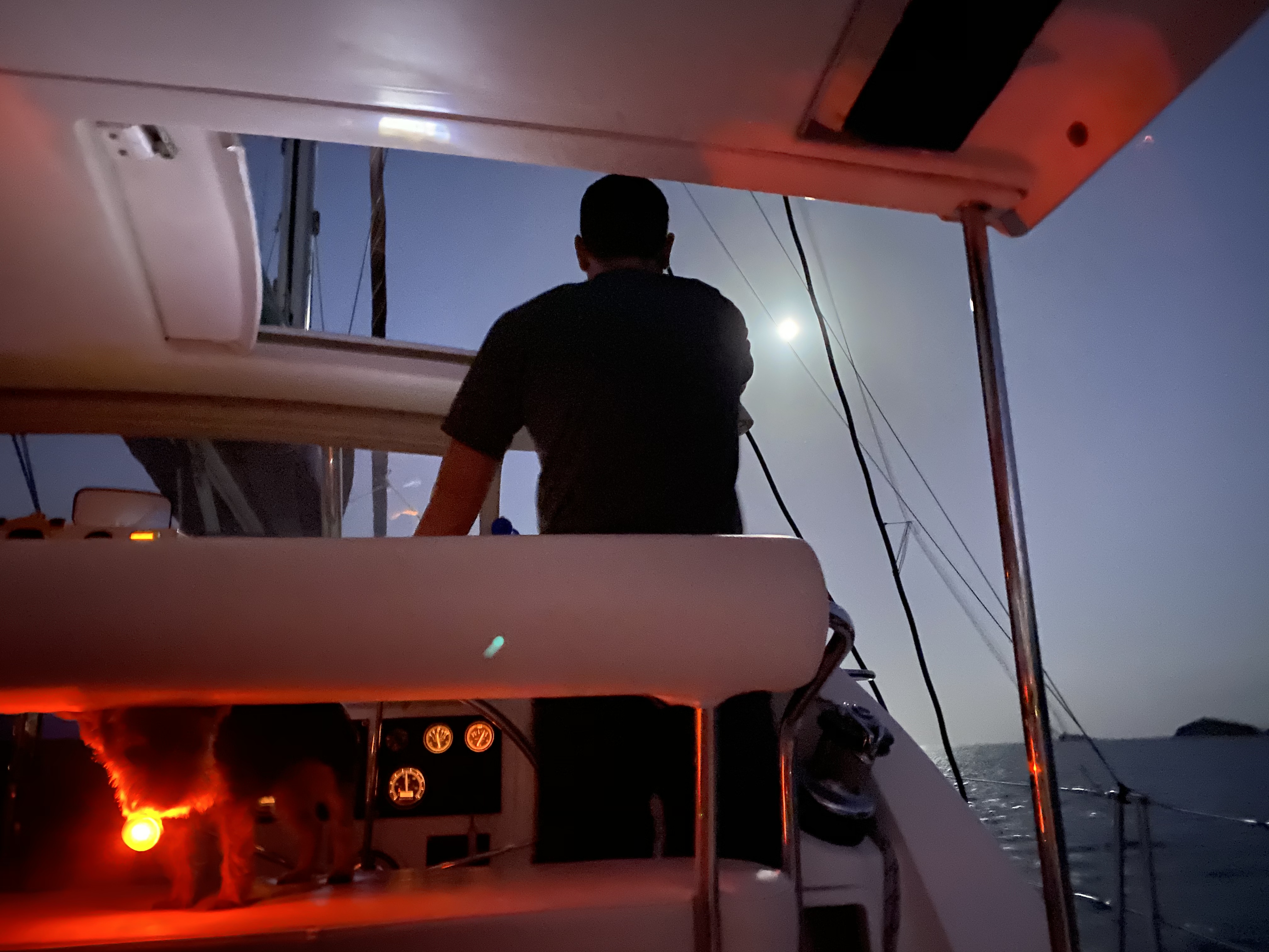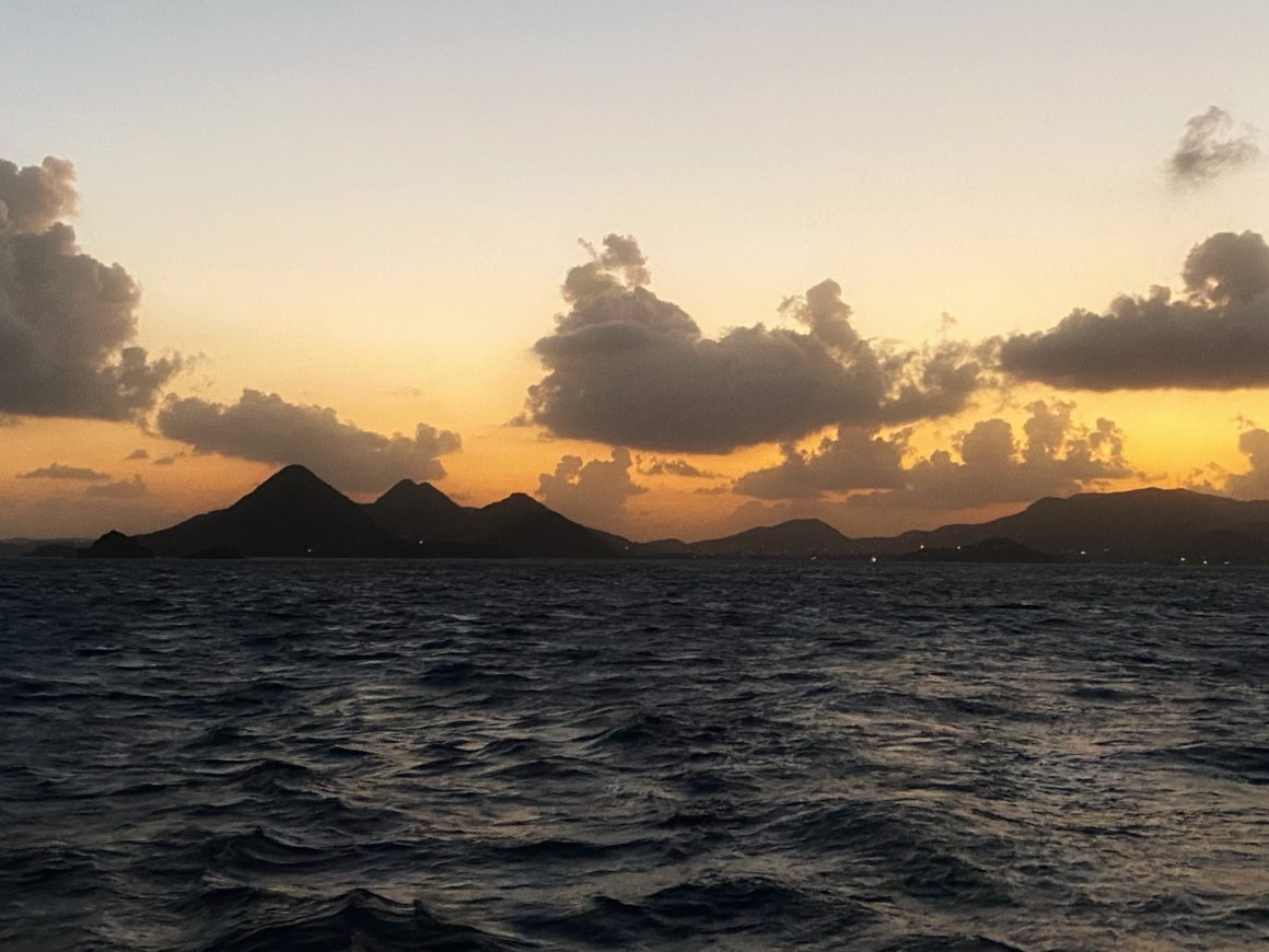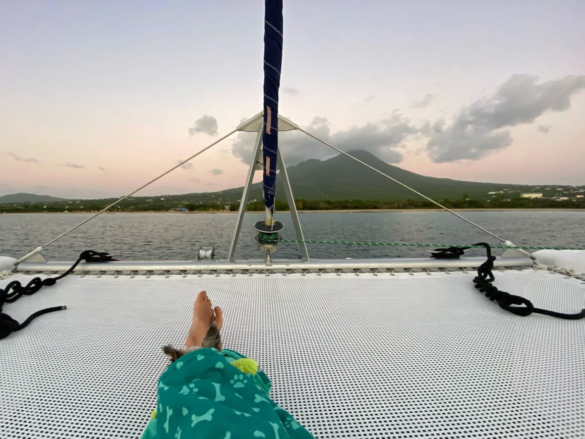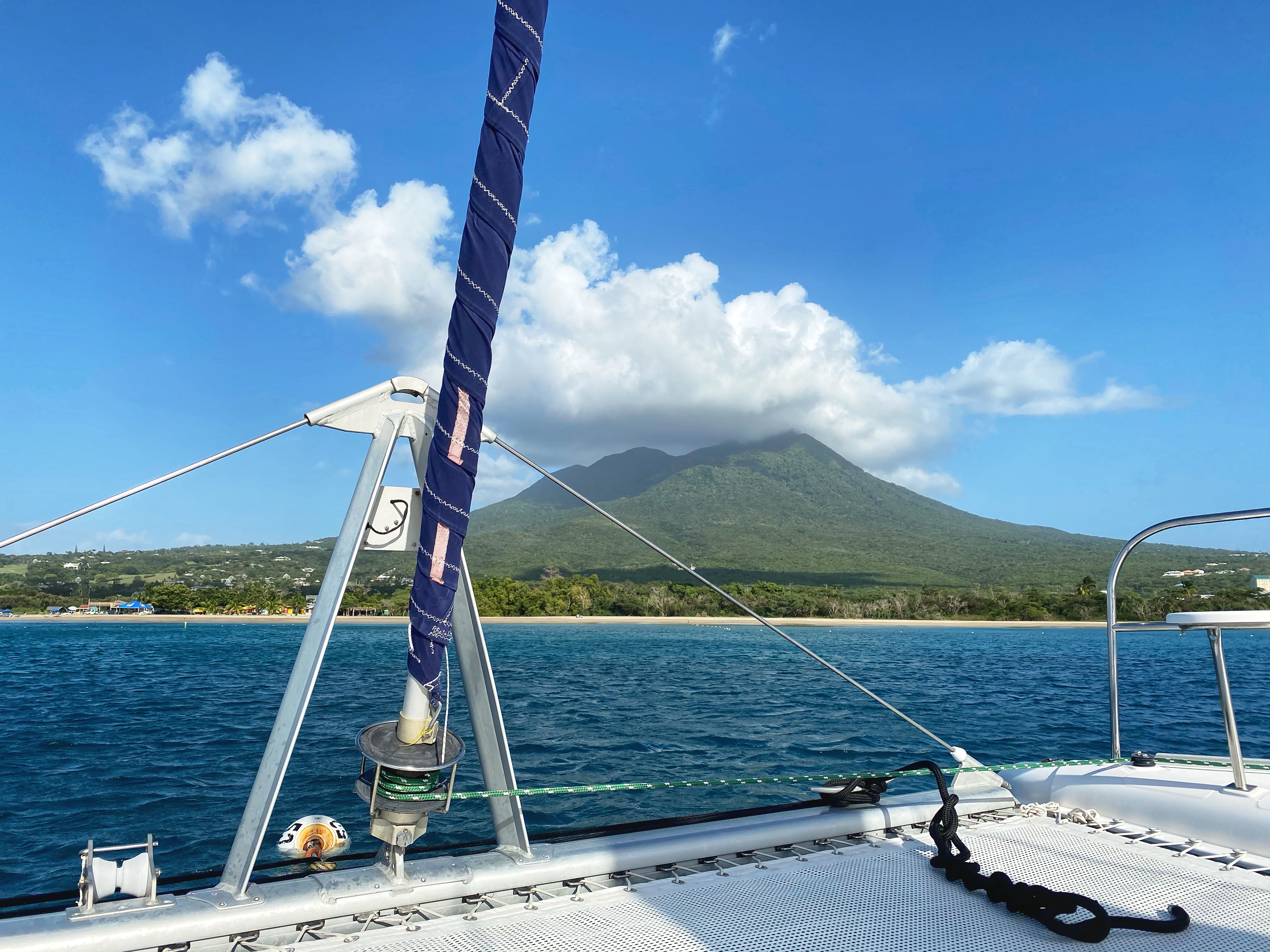 We wake up before the sun (again) to get an early start. A pretty sunrise helps – as always – fight against tired eyes. It isn’t our smoothest passage coming over to Nevis from Antigua. The seas are still very rough and trade winds brisk. For possibly the first time ever, though, the wind and waves are behind us! This means faster speeds and a smoother ride. The waves come behind us, raise us up, and then we surf down the other side picking up speed as we go. Although, our average speed is still only 7-8 MPH, we see speeds exceeding 10 MPH often as we surf down the waves, which feels exciting. The best part about this passage is we somehow manage to maintain cell signal the entire way from Antigua to here! These islands have some strong towers (and of course our booster is helping a lot).