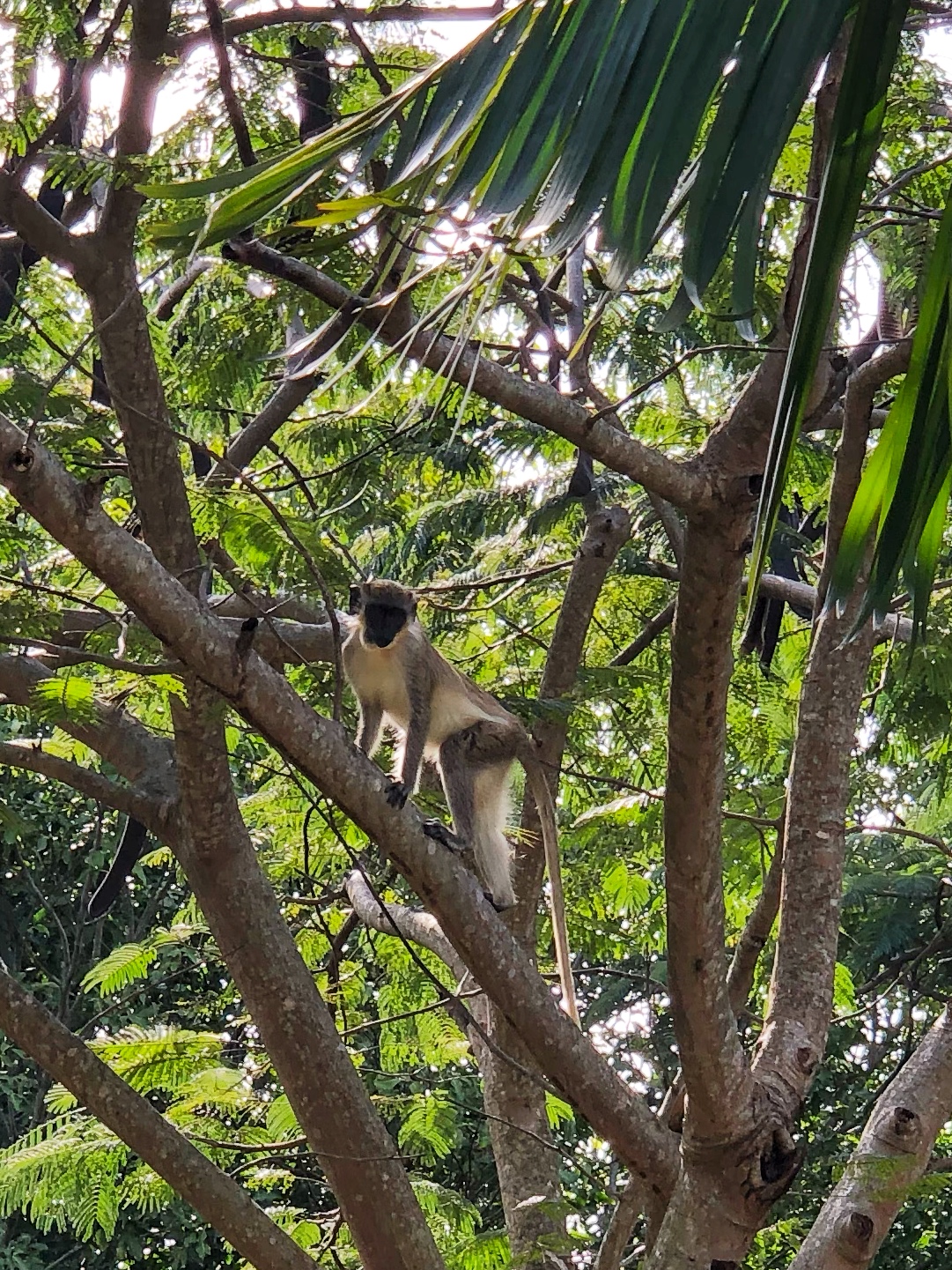 Next we decide to walk up to the nearby Bananas restaurant. Matt has a couple phone calls for work, so we’re hoping to find some internet and a place to relax. Best. Decision. Ever. We enter the grounds and are immediately blown away. The restaurant is set within a lush, tropical garden. As we enter, I spot a monkey sitting up in the tree curiously watching Monster. As we approach the small onsite boutique, we see a couple hummingbirds zooming by. After stopping in the boutique and purchasing a t-shirt, we pick out a table and take a seat. We’ve barely sat down, when I spot a huge orange caterpillar-like creature on one of the plants. Then the resident dog comes over to say hi. This place is an animal sanctuary.