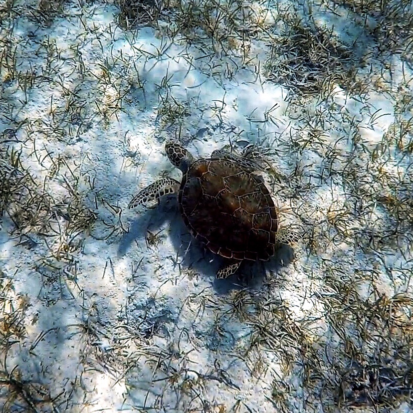 Once the reef runs out, we head in the direction of our anchored dinghy. On our way, we spot the cutest turtle hanging out, eating turtle grass. Often turtles (especially the smaller ones) are skittish and will swim away if you get very close. This one doesn’t seem to mind us at all, though. We must spend 10 minutes admiring the little guy. Our GoPro is dead, but Matt is able to get a couple more seconds out of it! Not to be outdone – another cute turtle swims up to us and begins showing off, pulling up turtle grass and chomping away at it. Watching turtles never gets old.