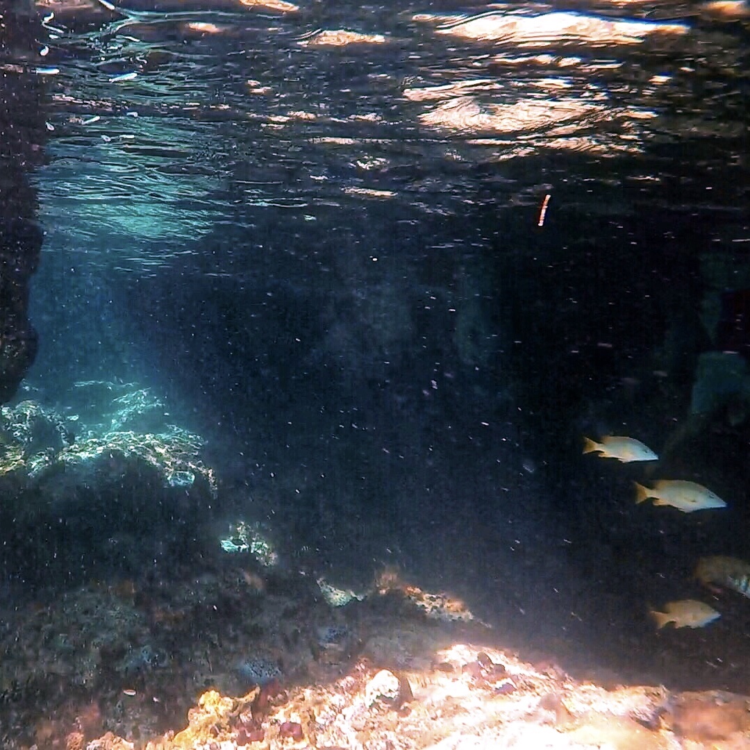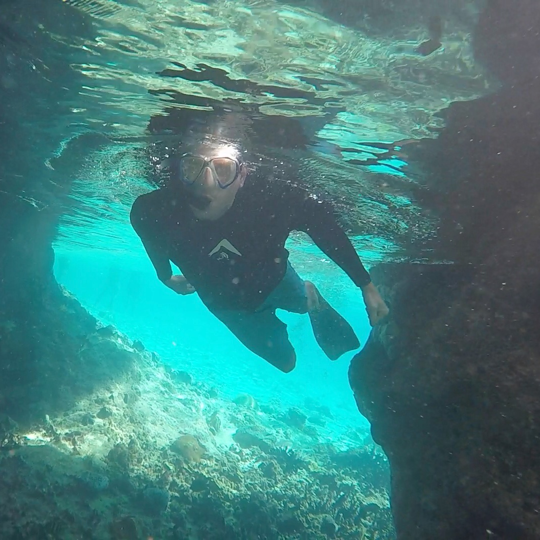 We notice that the people have started to thin out, so we head back into the main area of the Grotto. This area has tons of aquarium fish and we notice lots of swim throughs under water. It’s pretty cool, but after a several minutes we feel we’ve seen it all, so we exit out the other side of the Grotto to snorkel the reef on that side. It’s a really nice little reef, but the current is quite strong again. Rather than fight it, we stop kicking and let it just push us along the reef for a very enjoyable drift snorkel.