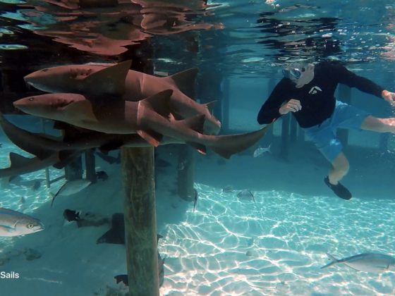 One of the first things that comes to mind when someone mentions the Exumas are the infamous swimming pigs. These are even more well-known than the nurse sharks we enjoyed so much. There are a few islands now that have pigs lined up on the beach as a tourist attraction, but the original pigs of the Exumas reside on Big Majors, which is right by Staniel Cay. This is also next to Thunderball Grotto – a popular snorkeling destination, which got its name from the 1965 James Bond film, “Thunderball,” which was shot here.