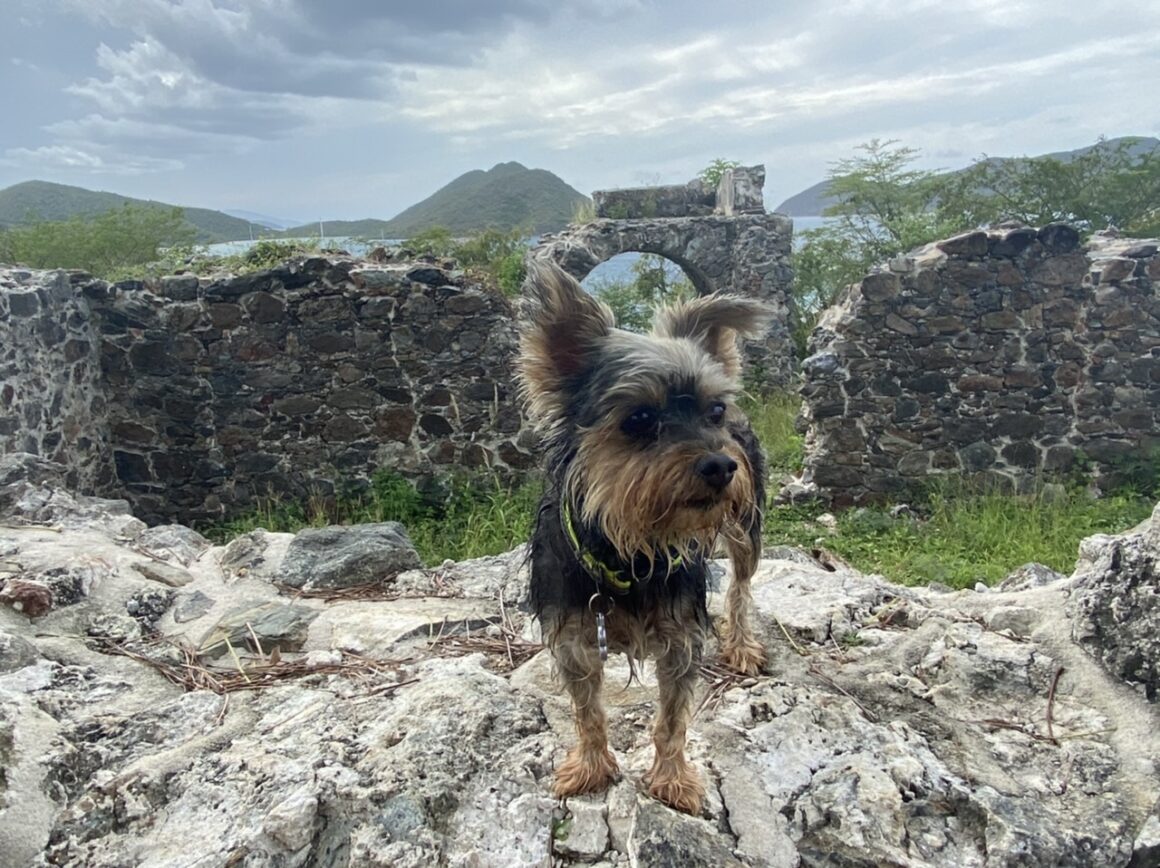 Leinster Bay is a desirable spot, I’ll admit. It’s very protected with a small beach, hiking, and snorkeling all right here. Even better is that the mooring balls are currently free since the National Park is closed due to the pandemic. Normally each night would cost a steep $28. We enjoy paddle boarding around the bay and taking Monster on short hikes from the beach. There are lots of sugar plantation ruins in the area which provide some interesting sites to visit.