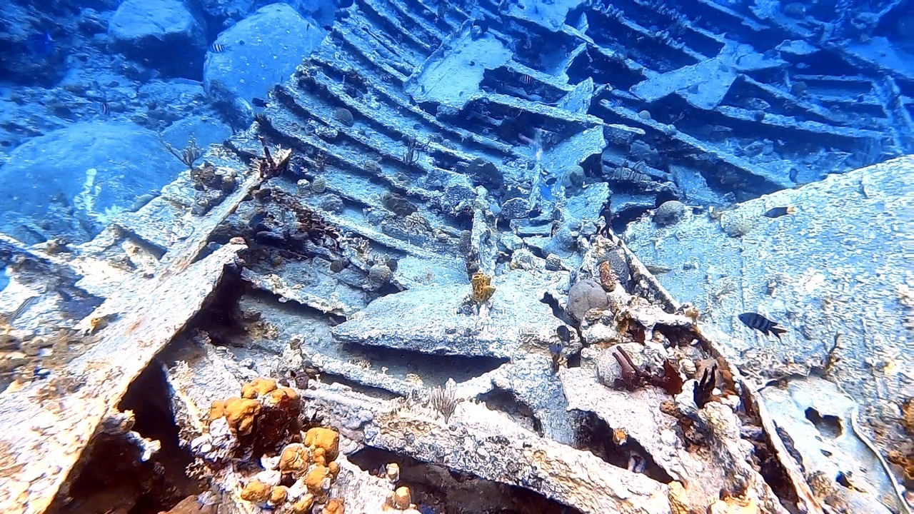 We check out the diving spots – first heading to the BVI Art Reef. This is a ship purposedly sunk in effort to make an artificial reef. The “art” part of it is a massive metal scultpure of a kraken (i.e. an octopus). I actually remember reading about this a couple years back – the dive community was pretty excited about it. Somehow the sculpture managed to survive the worst of hurricane Irma and Maria in 2017, only to be partially swept away shortly after due to extreme surge. So – when we dive down, we only see some wire structure that isn’t really identifiable as a kraken.