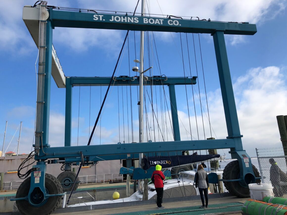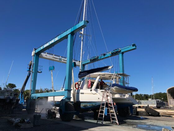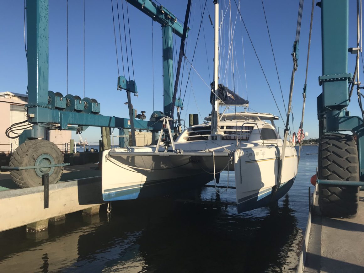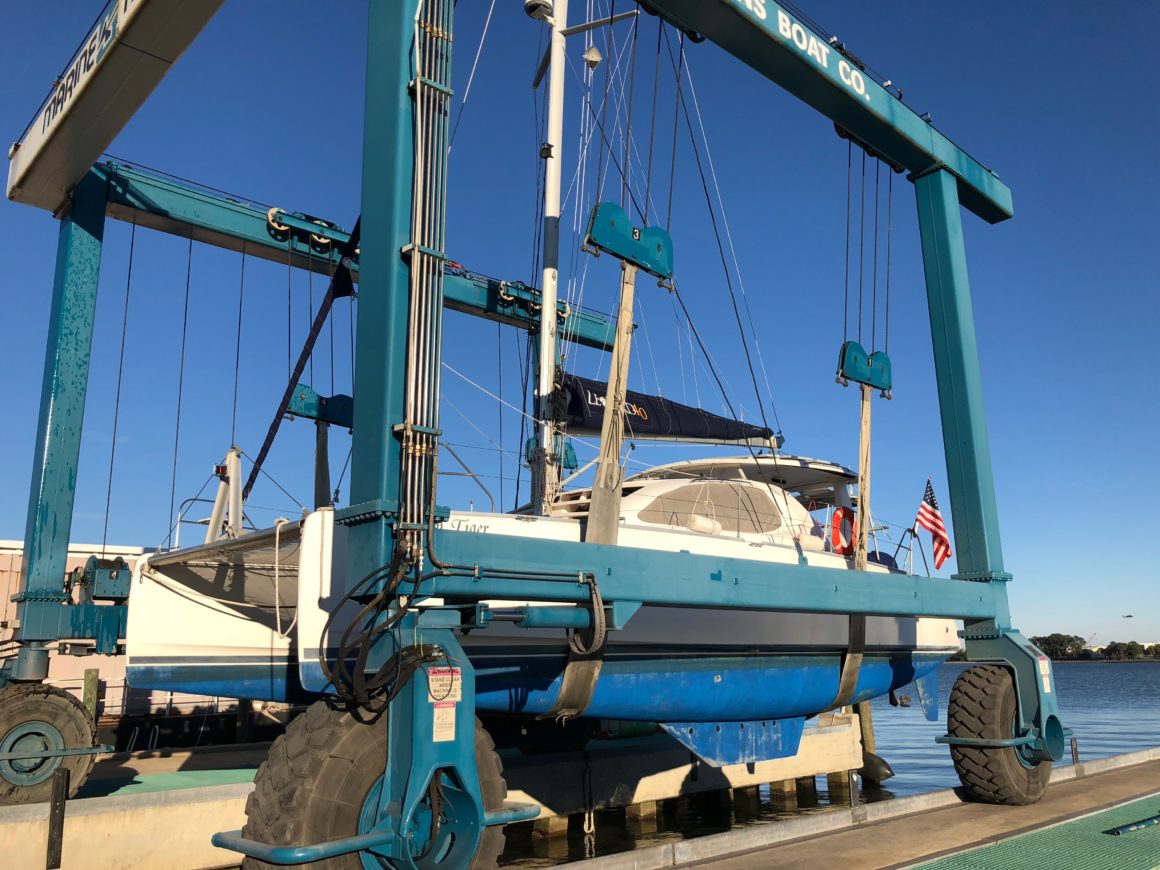 As part of the survey, the hull will be inspected to make sure it’s sound (among many other things I’m sure). As such, it is necessary to pull the boat out of the water. For many sailboats, this isn’t a huge problem – but for catamarans, it is often challenging to find a boat yard that can haul out a boat that is so wide. The nearest place that could haul out our boat was Jacksonville, FL and in Jacksonville, there is only one boat yard that is able to do so.